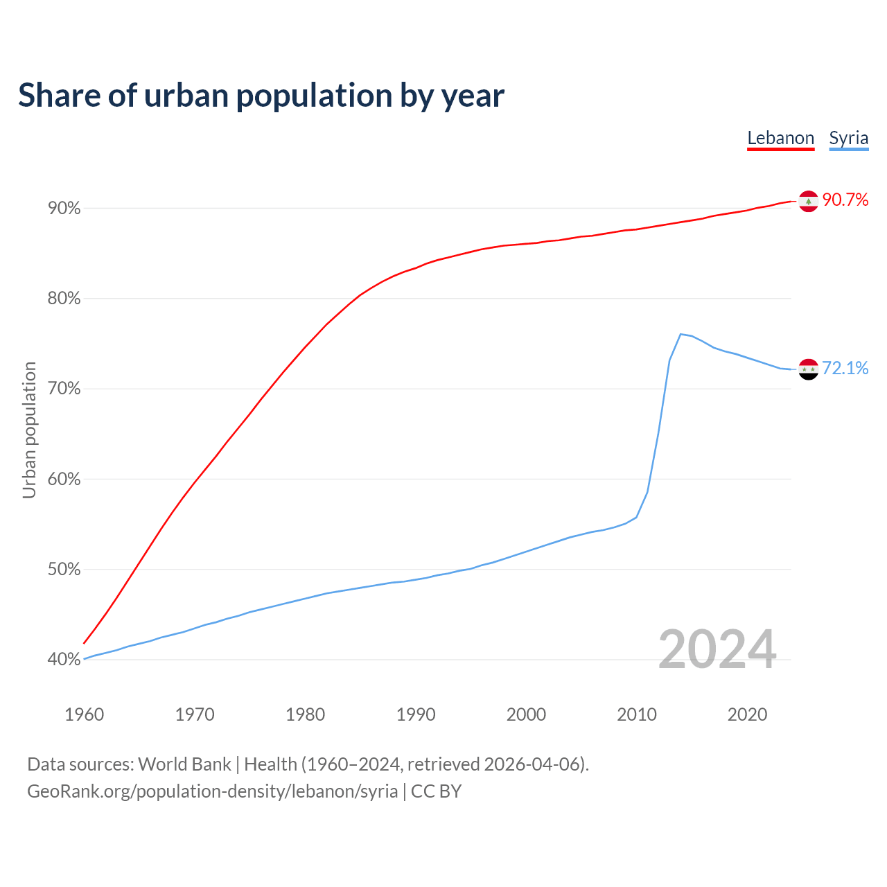 From 2004 to 2024, the share of urban population changed from 86.6% to 90.7% in Lebanon and from 53.5% to 72.1% in Syria.