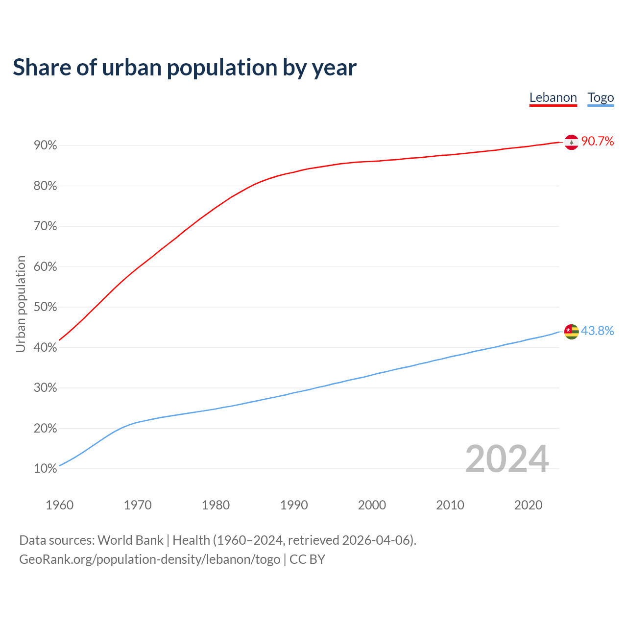 From 2004 to 2024, the share of urban population changed from 86.6% to 90.7% in Lebanon and from 34.9% to 43.8% in Togo.