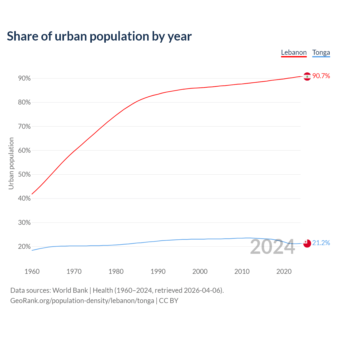 From 2004 to 2024, the share of urban population changed from 86.6% to 90.7% in Lebanon and from 23.1% to 21.2% in Tonga.