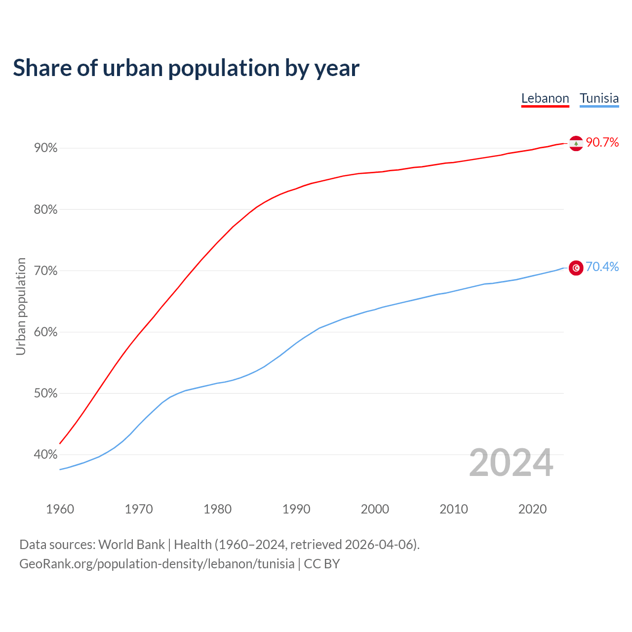 From 2004 to 2024, the share of urban population changed from 86.6% to 90.7% in Lebanon and from 64.9% to 70.4% in Tunisia.