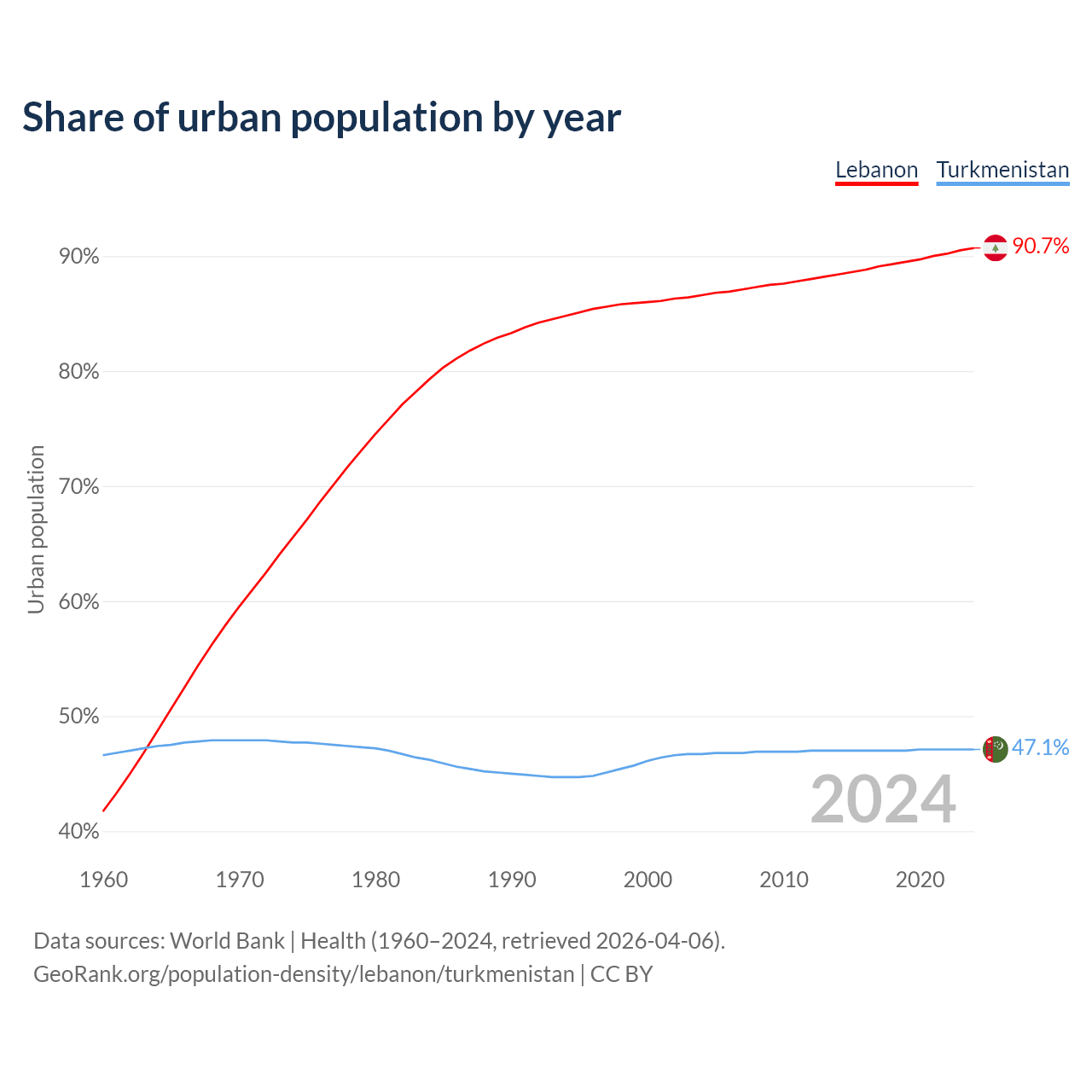 From 2004 to 2024, the share of urban population changed from 86.6% to 90.7% in Lebanon and from 46.7% to 47.1% in Turkmenistan.