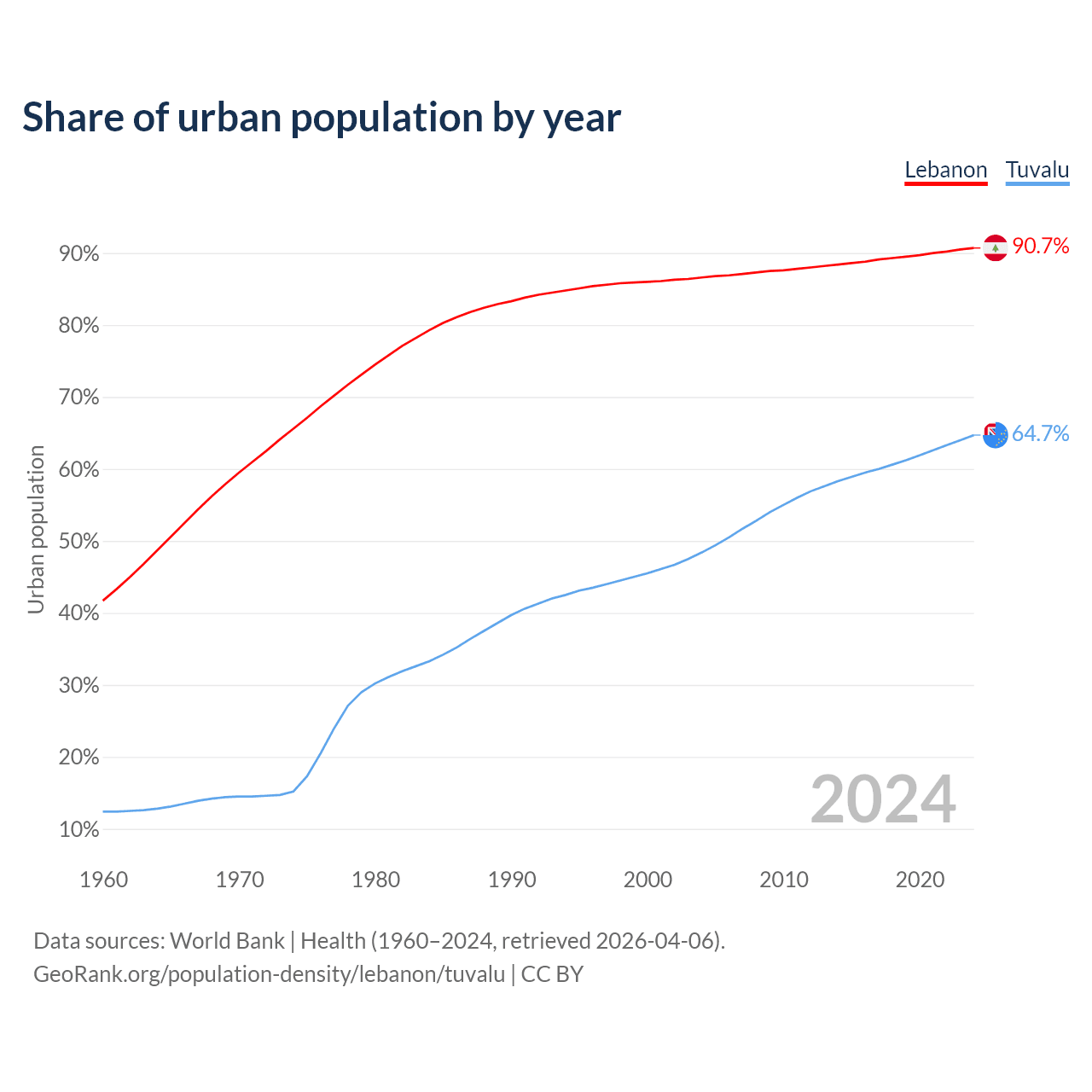 From 2004 to 2024, the share of urban population changed from 86.6% to 90.7% in Lebanon and from 48.4% to 64.7% in Tuvalu.
