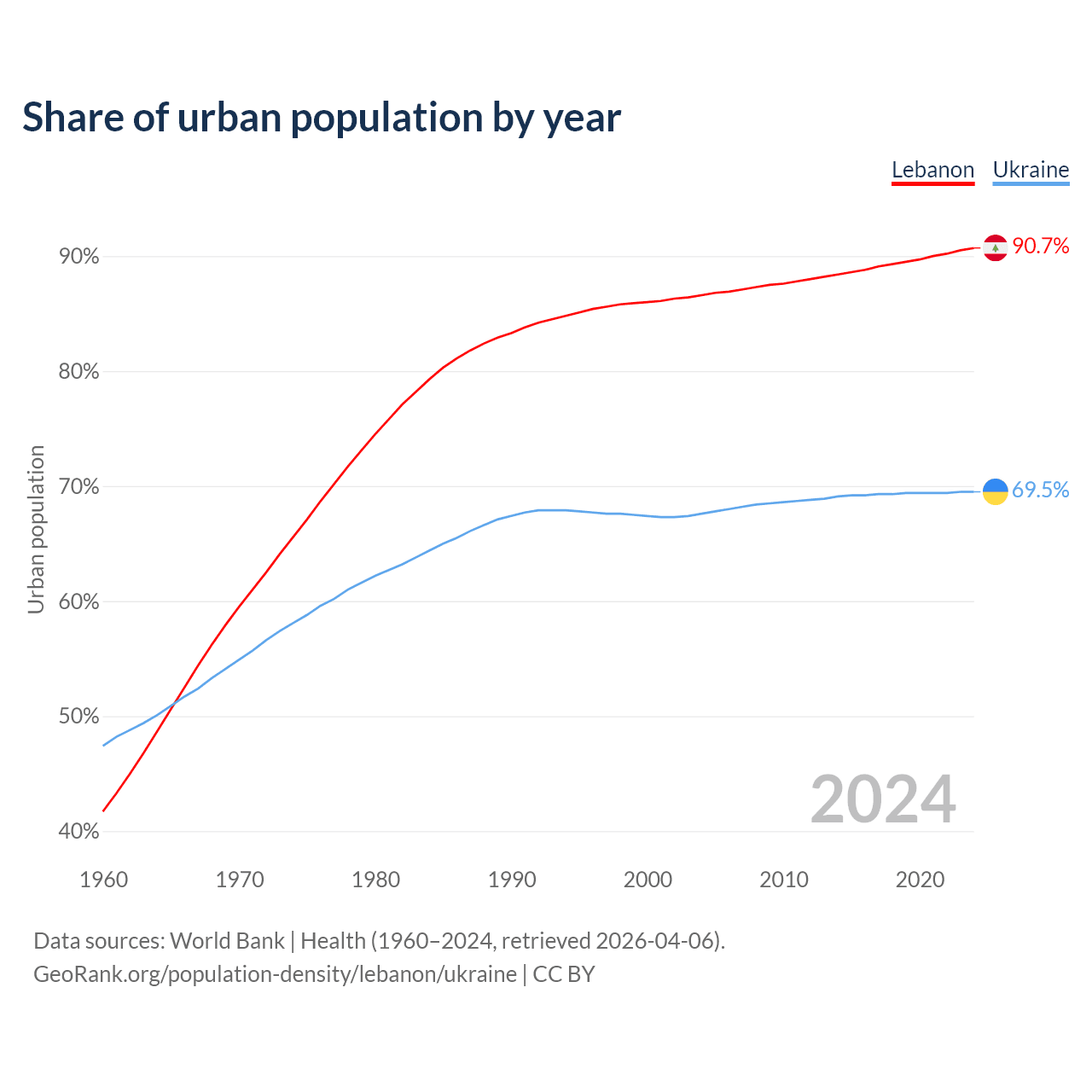 From 2004 to 2024, the share of urban population changed from 86.6% to 90.7% in Lebanon and from 67.6% to 69.5% in Ukraine.