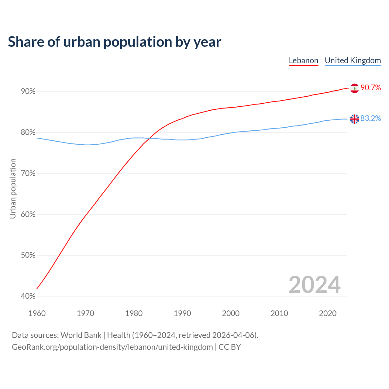 From 2004 to 2024, the share of urban population changed from 86.6% to 90.7% in Lebanon and from 80.3% to 83.2% in the United Kingdom.