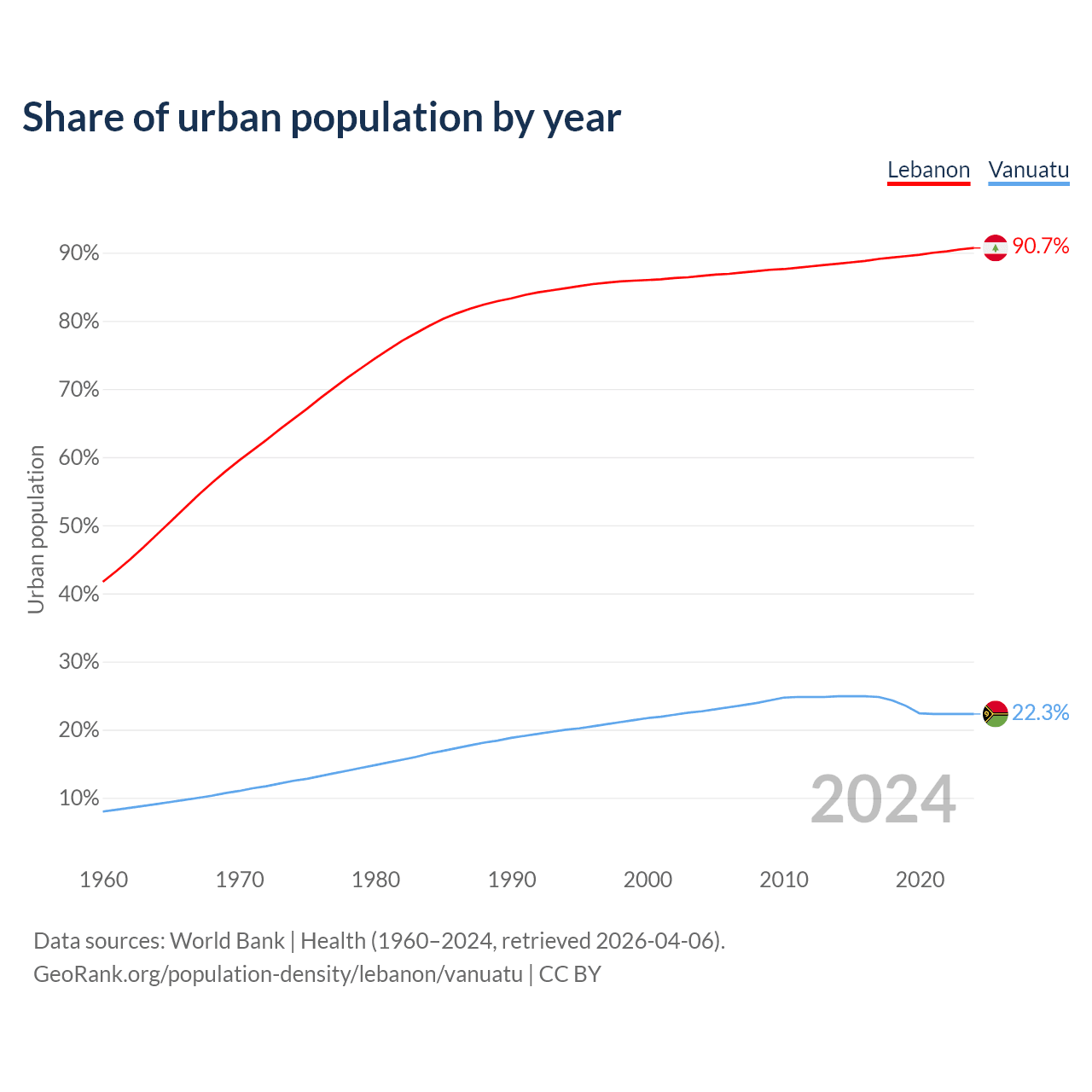 From 2004 to 2024, the share of urban population changed from 86.6% to 90.7% in Lebanon and from 22.7% to 22.3% in Vanuatu.