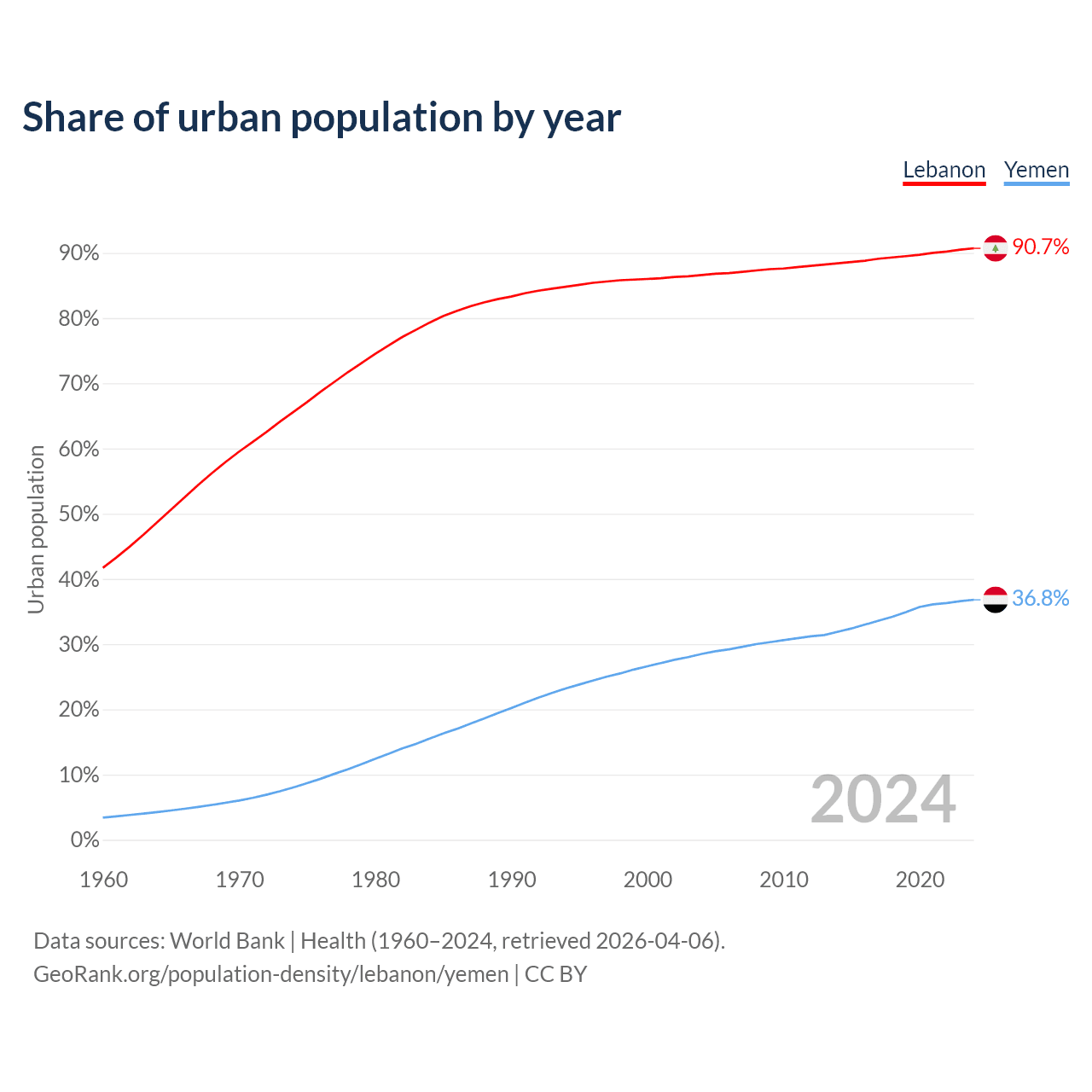 From 2004 to 2024, the share of urban population changed from 86.6% to 90.7% in Lebanon and from 28.5% to 36.8% in Yemen.
