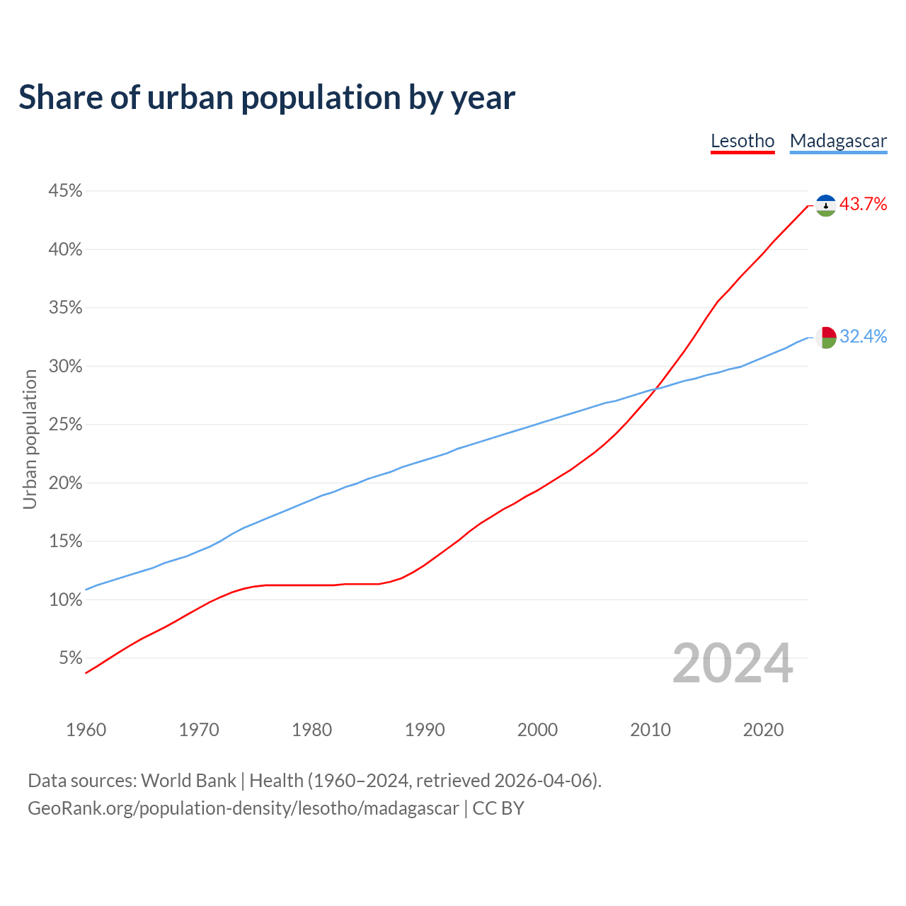 From 2004 to 2024, the share of urban population changed from 21.8% to 43.7% in Lesotho and from 26.2% to 32.4% in Madagascar.