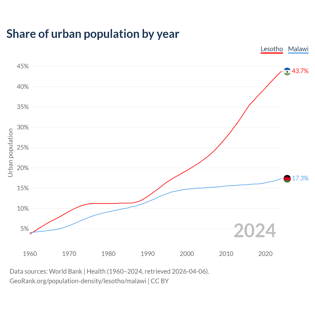 From 2004 to 2024, the share of urban population changed from 21.8% to 43.7% in Lesotho and from 15% to 17.3% in Malawi.