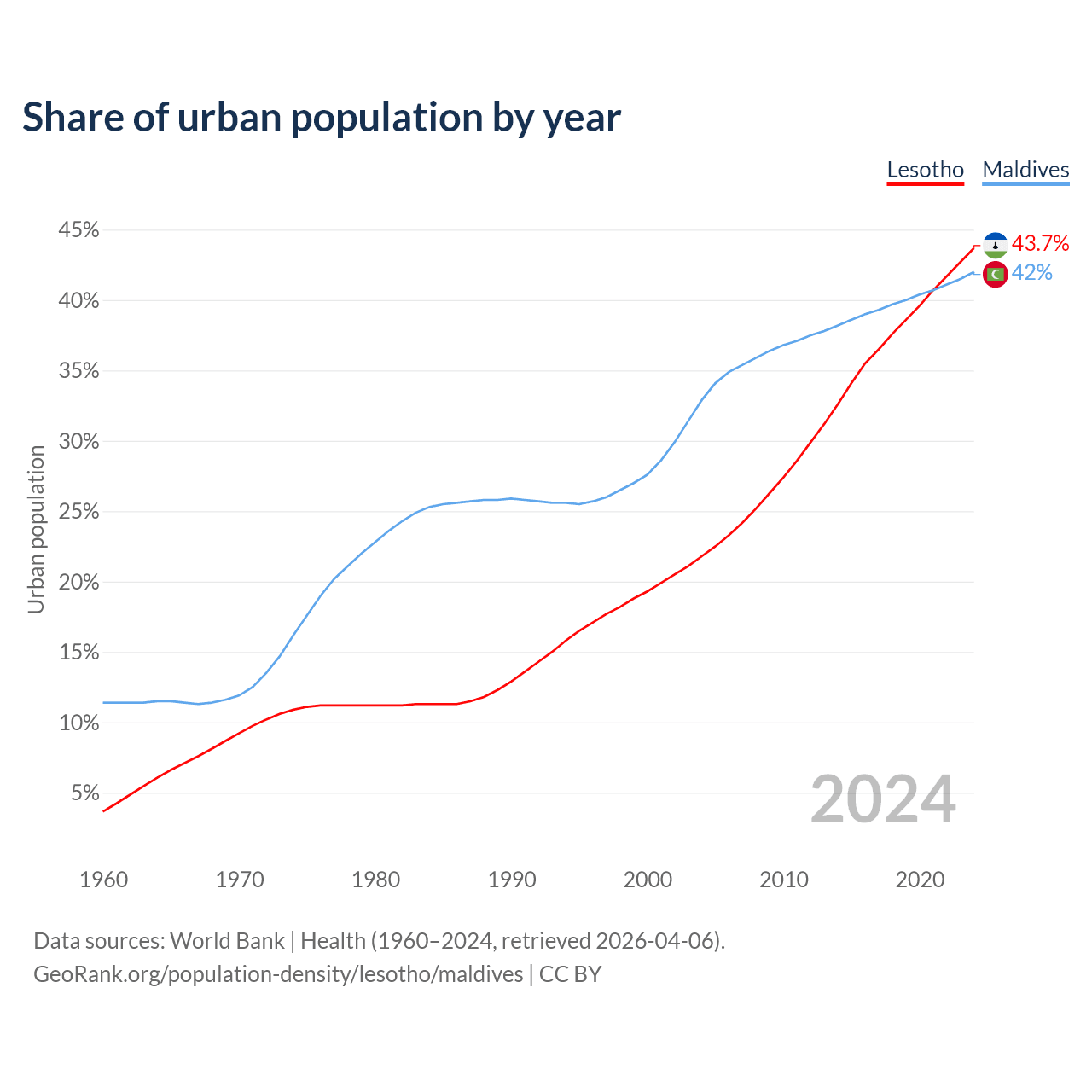 From 2004 to 2024, the share of urban population changed from 21.8% to 43.7% in Lesotho and from 32.9% to 42% in Maldives.