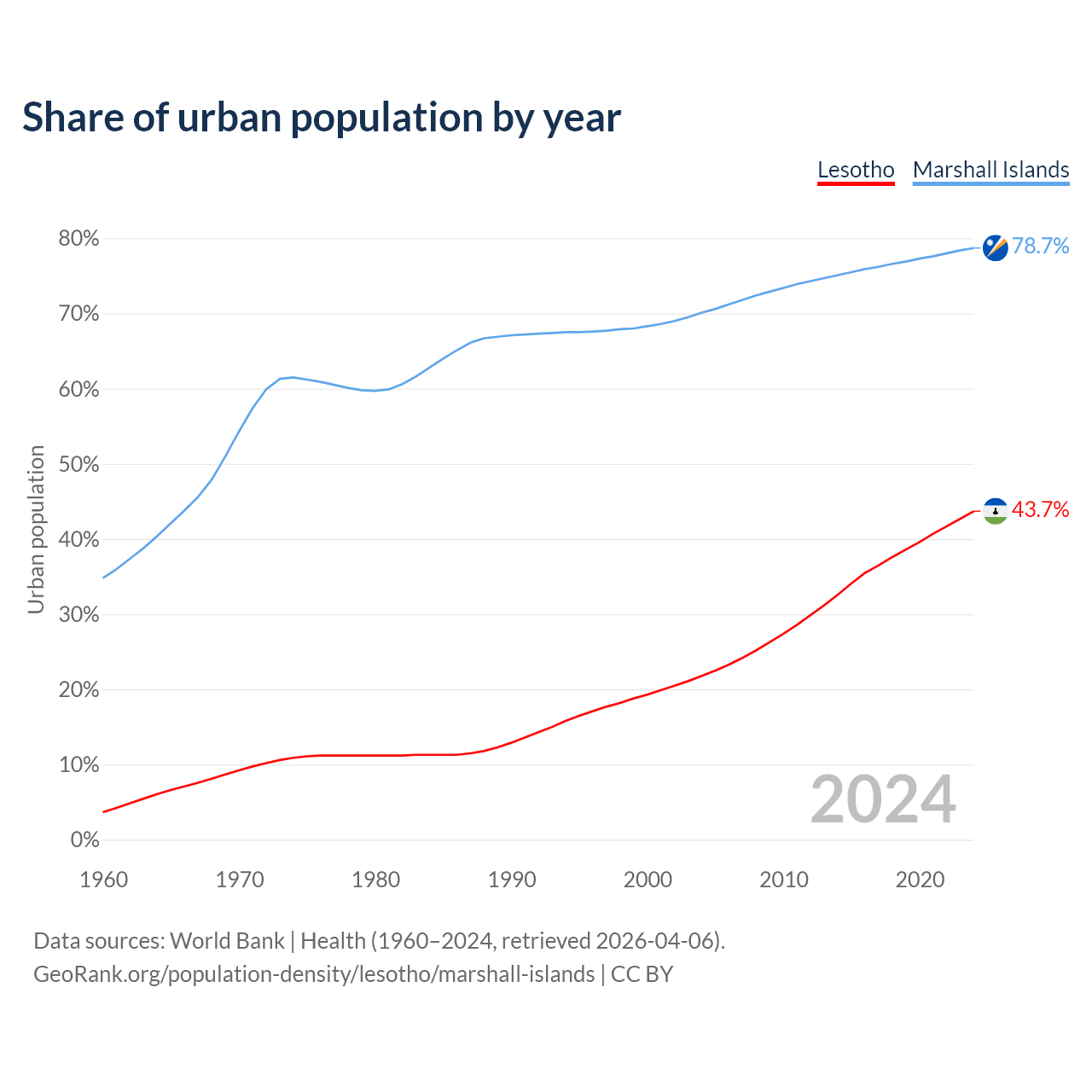 From 2004 to 2024, the share of urban population changed from 21.8% to 43.7% in Lesotho and from 70.1% to 78.7% in the Marshall Islands.