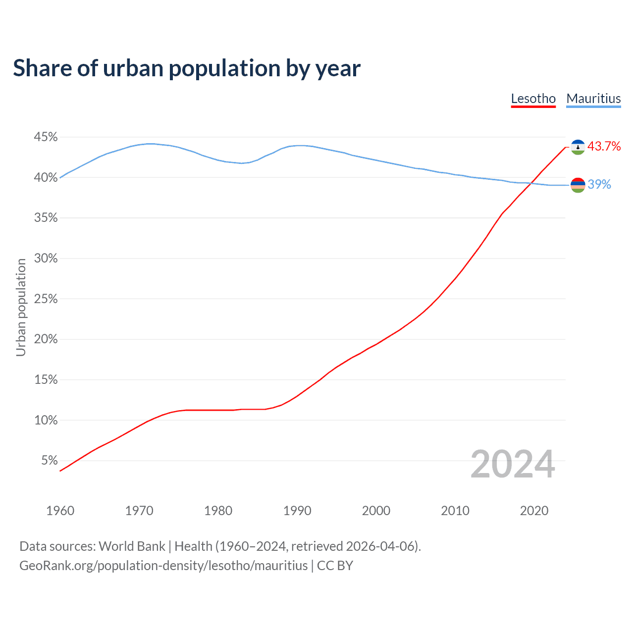 From 2004 to 2024, the share of urban population changed from 21.8% to 43.7% in Lesotho and from 41.3% to 39% in Mauritius.