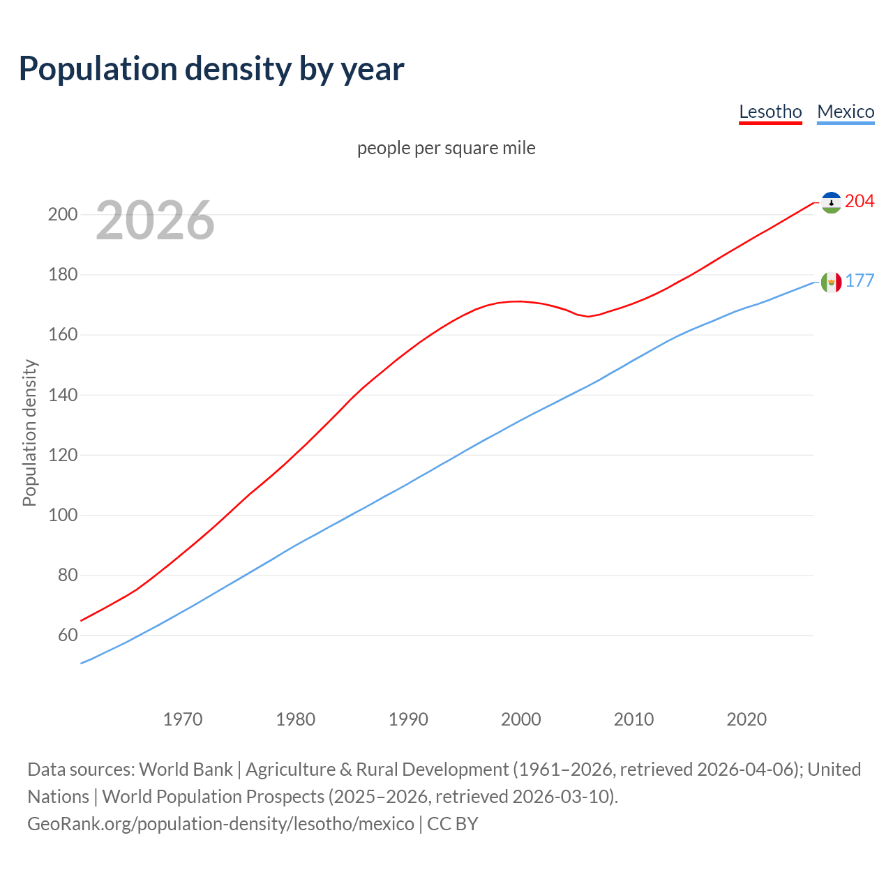From 2006 to 2026, population density in Lesotho increased by 22.9%, compared to a 24% growth in Mexico.