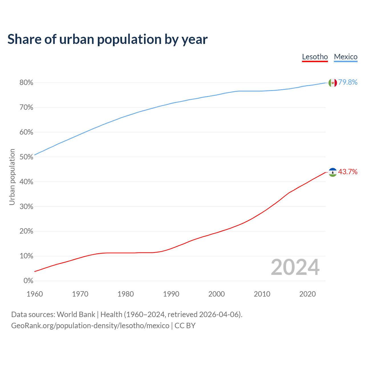 From 2004 to 2024, the share of urban population changed from 21.8% to 43.7% in Lesotho and from 76.3% to 79.8% in Mexico.