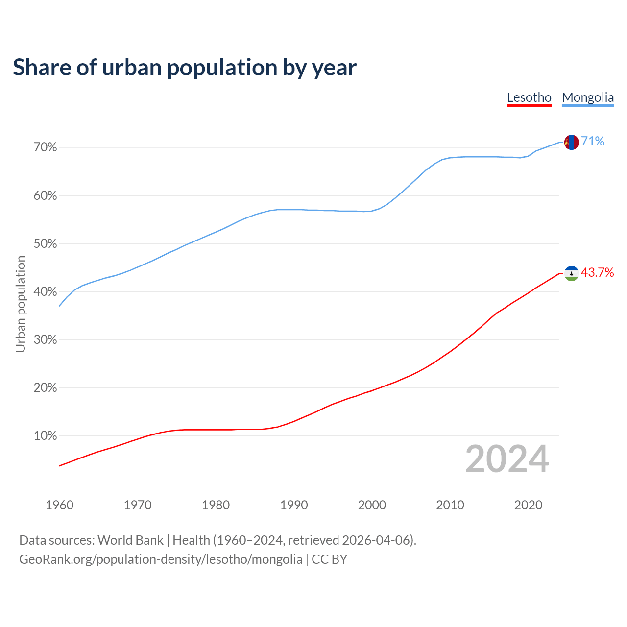 From 2004 to 2024, the share of urban population changed from 21.8% to 43.7% in Lesotho and from 60.8% to 71% in Mongolia.