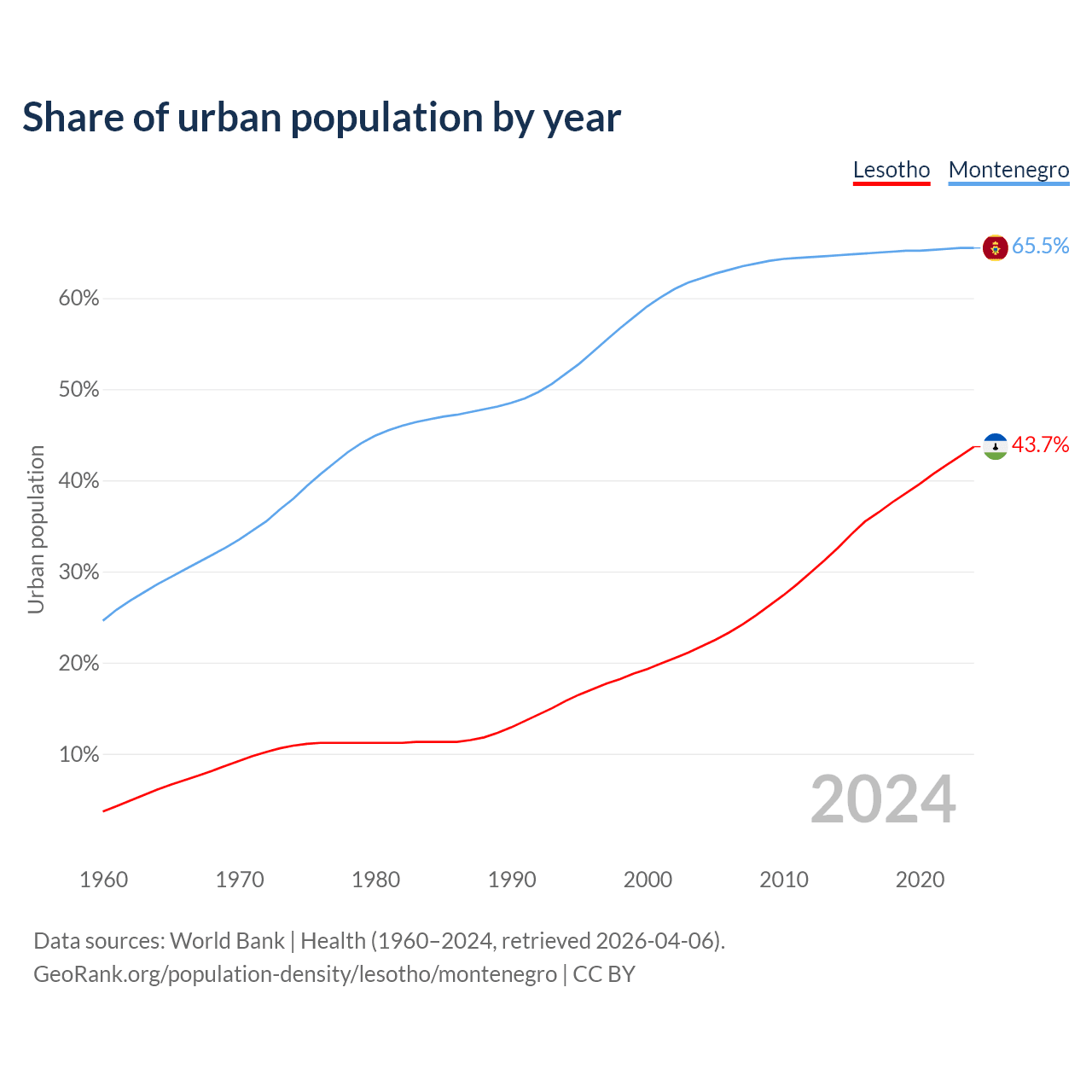 From 2004 to 2024, the share of urban population changed from 21.8% to 43.7% in Lesotho and from 62.2% to 65.5% in Montenegro.