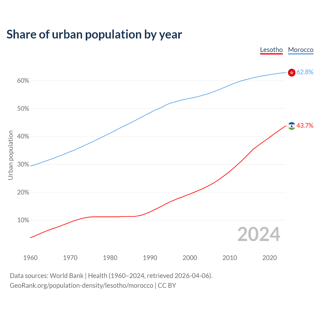 From 2004 to 2024, the share of urban population changed from 21.8% to 43.7% in Lesotho and from 55% to 62.8% in Morocco.