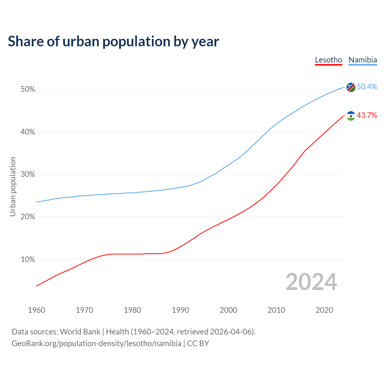 From 2004 to 2024, the share of urban population changed from 21.8% to 43.7% in Lesotho and from 35.5% to 50.4% in Namibia.