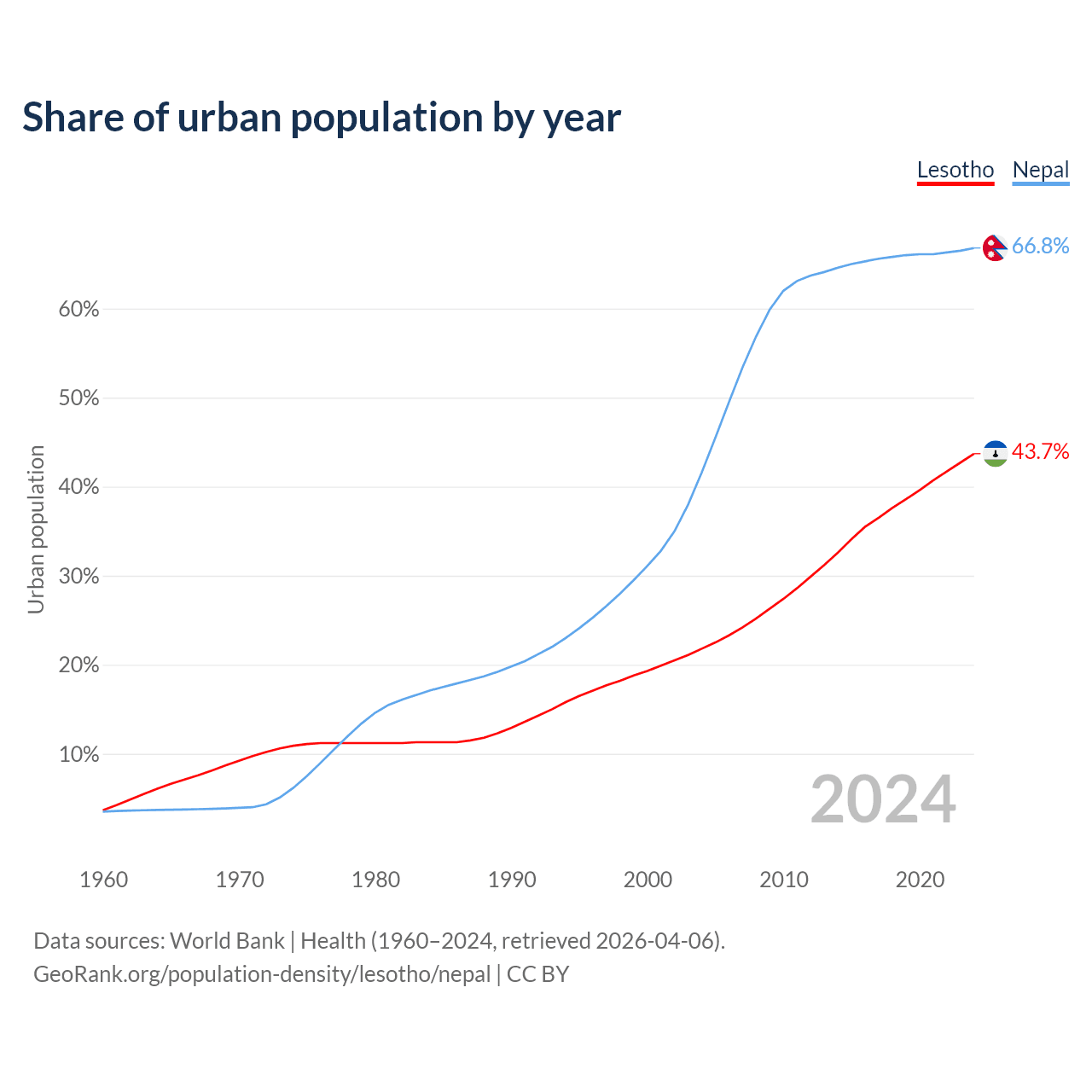 From 2004 to 2024, the share of urban population changed from 21.8% to 43.7% in Lesotho and from 41.6% to 66.8% in Nepal.