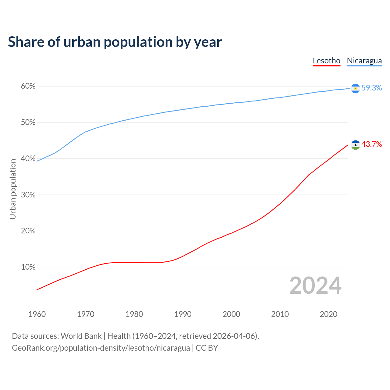 From 2004 to 2024, the share of urban population changed from 21.8% to 43.7% in Lesotho and from 55.8% to 59.3% in Nicaragua.