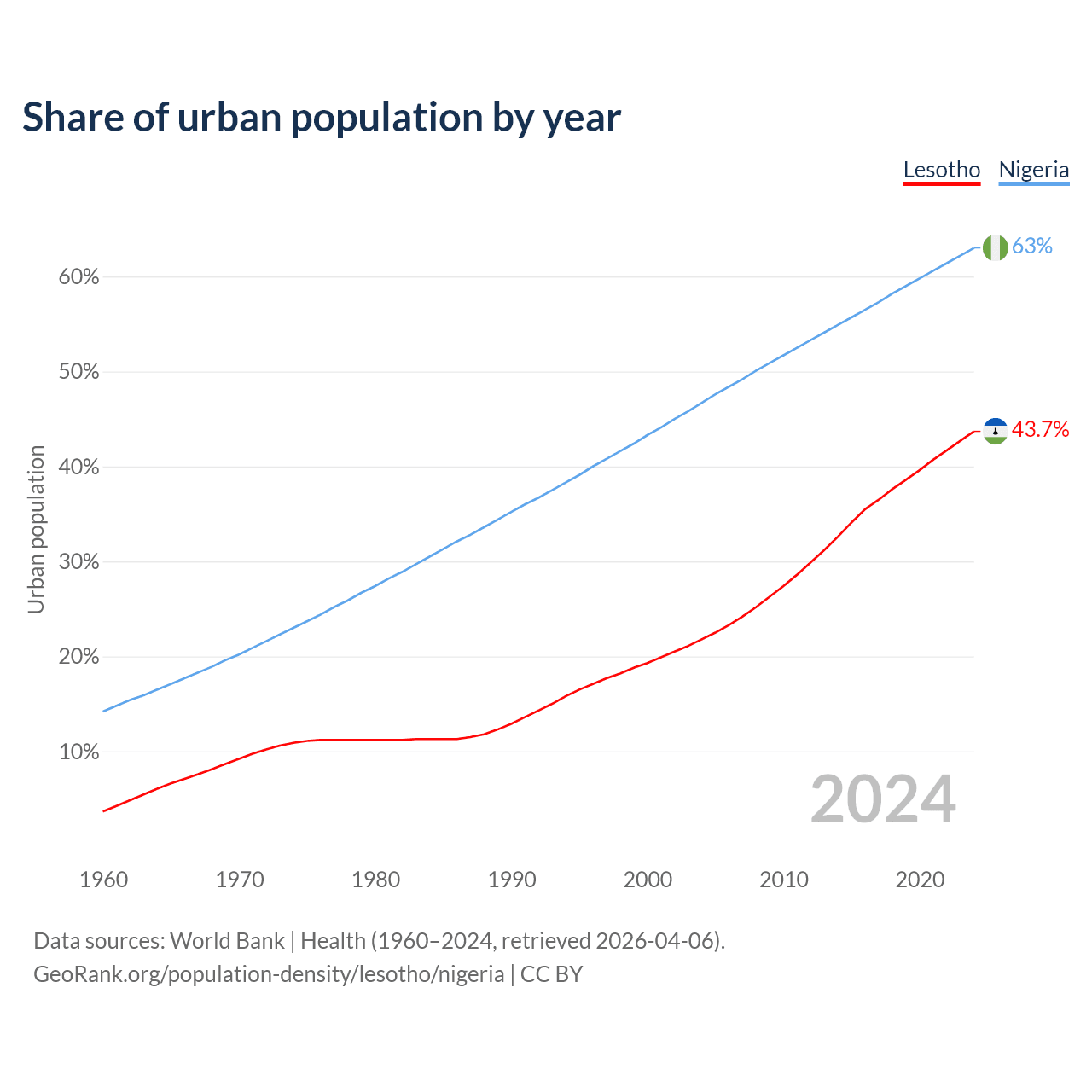 From 2004 to 2024, the share of urban population changed from 21.8% to 43.7% in Lesotho and from 46.7% to 63% in Nigeria.