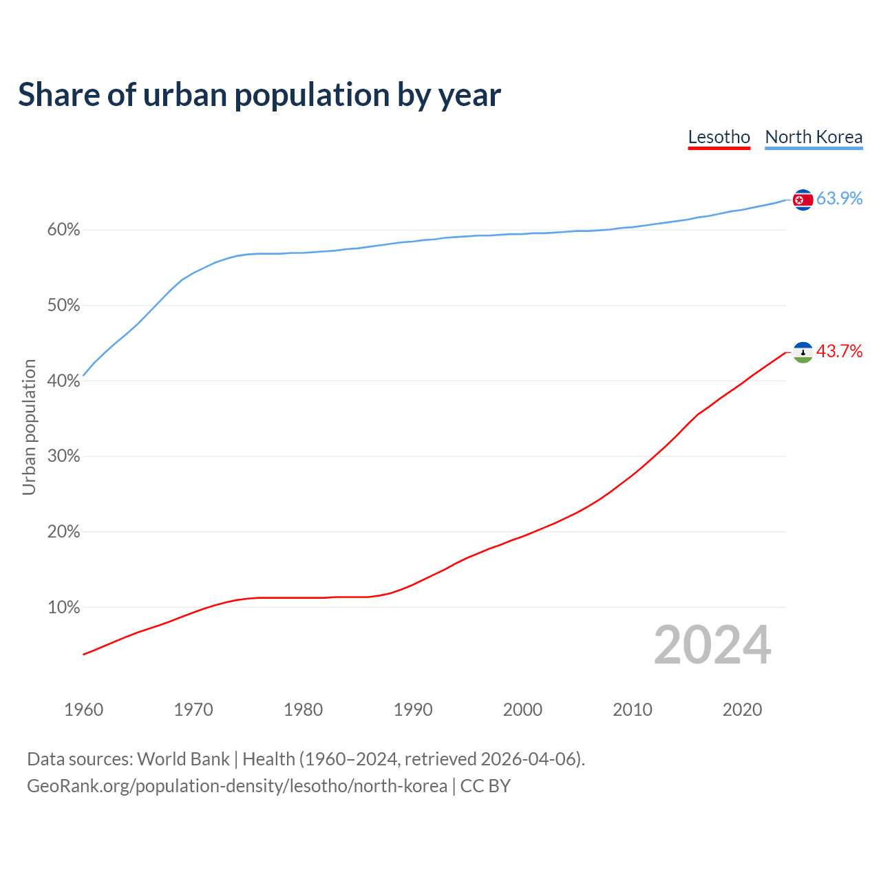 From 2004 to 2024, the share of urban population changed from 21.8% to 43.7% in Lesotho and from 59.7% to 63.9% in North Korea.