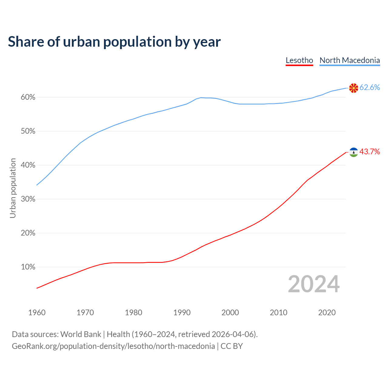 From 2004 to 2024, the share of urban population changed from 21.8% to 43.7% in Lesotho and from 57.9% to 62.6% in North Macedonia.