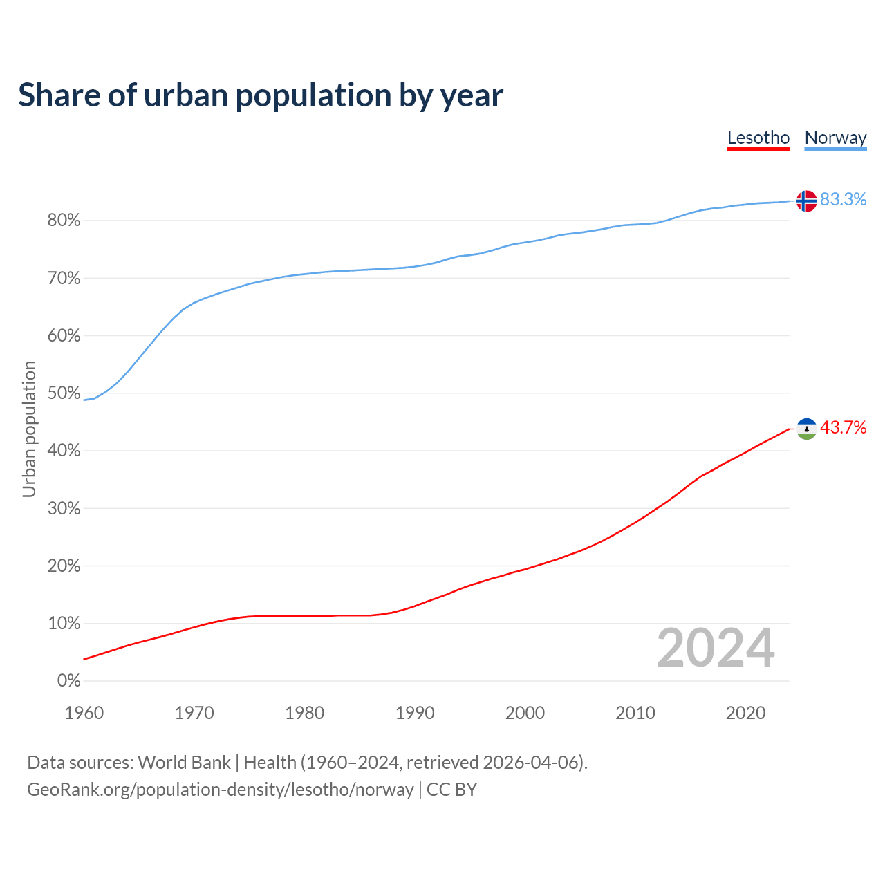 From 2004 to 2024, the share of urban population changed from 21.8% to 43.7% in Lesotho and from 77.6% to 83.3% in Norway.