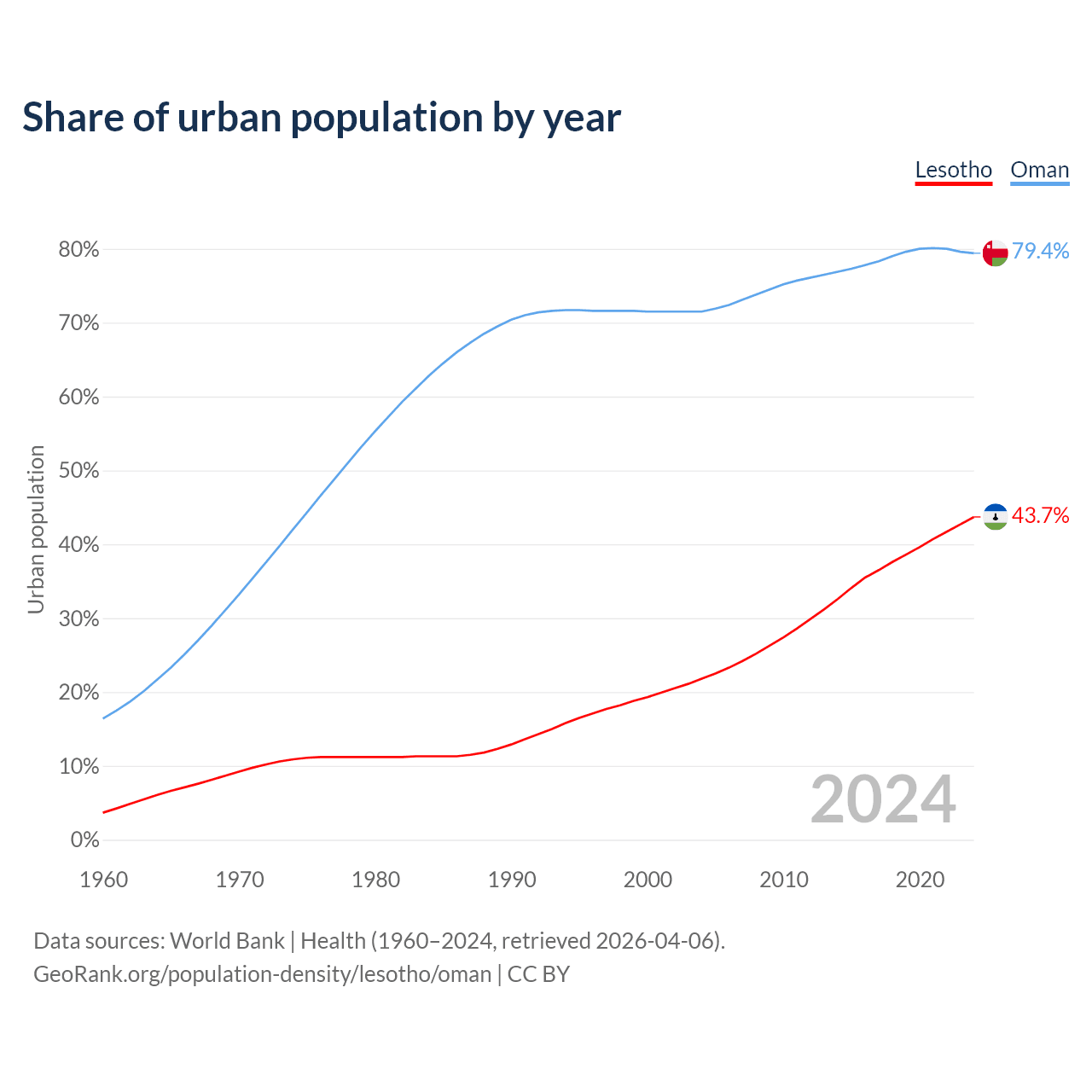 From 2004 to 2024, the share of urban population changed from 21.8% to 43.7% in Lesotho and from 71.5% to 79.4% in Oman.