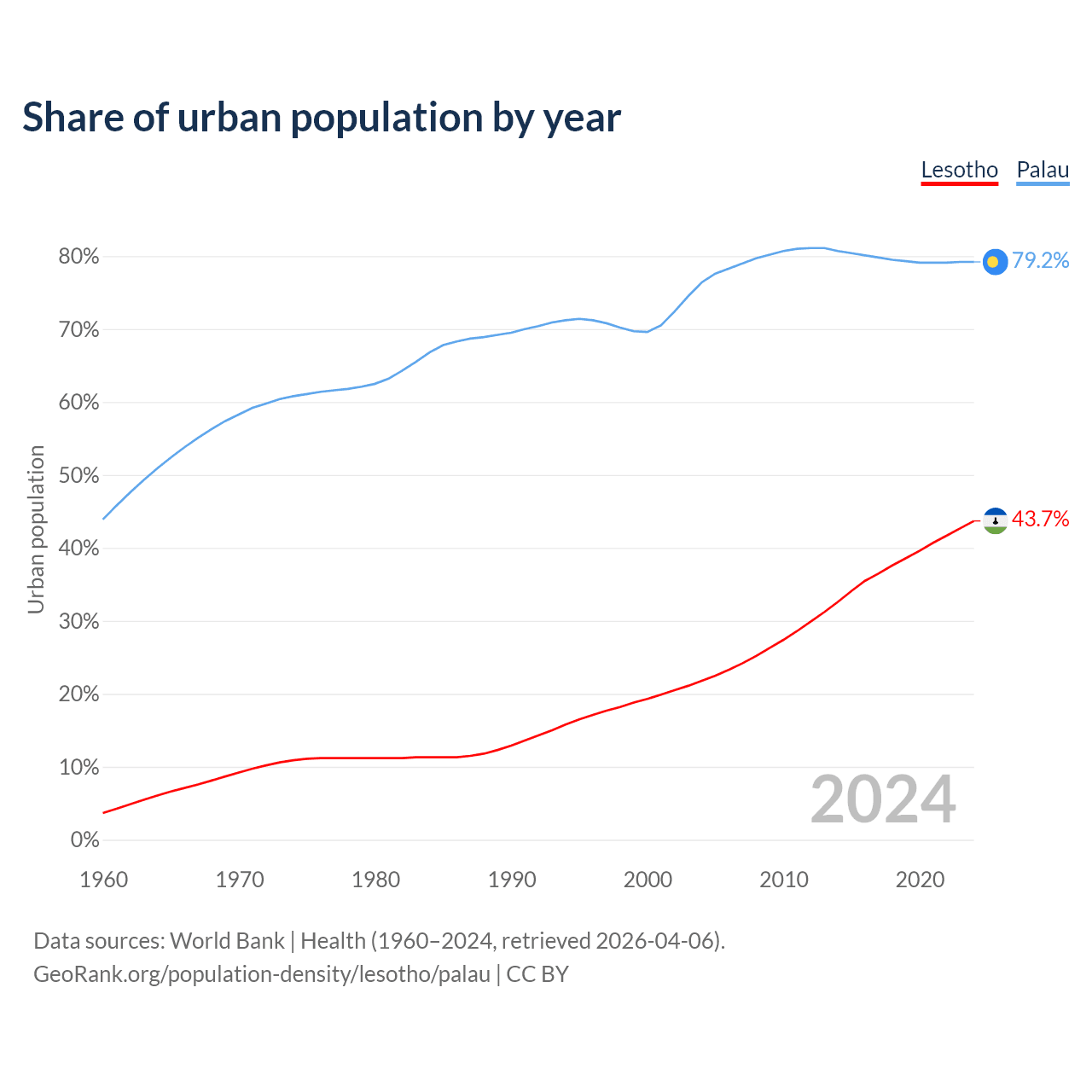 From 2004 to 2024, the share of urban population changed from 21.8% to 43.7% in Lesotho and from 76.4% to 79.2% in Palau.