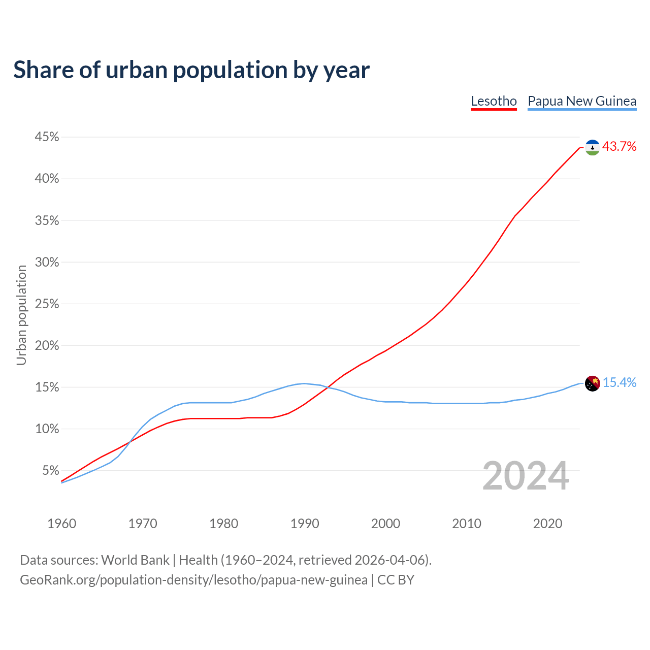 From 2004 to 2024, the share of urban population changed from 21.8% to 43.7% in Lesotho and from 13.1% to 15.4% in Papua New Guinea.