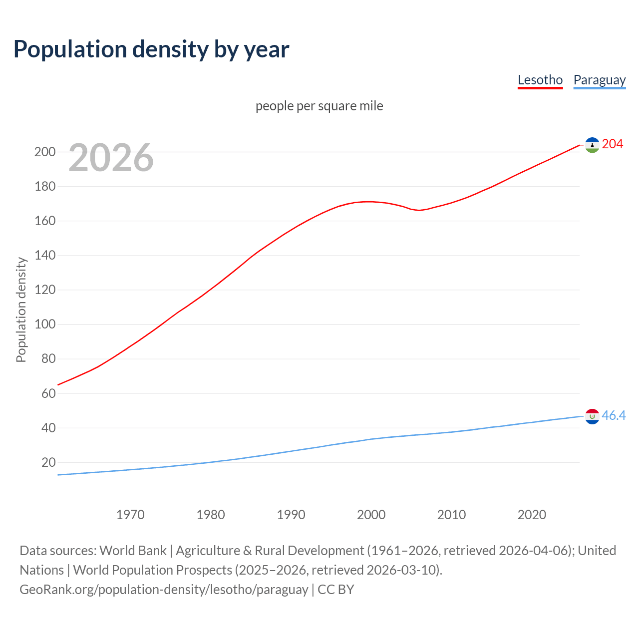 From 2006 to 2026, population density in Lesotho increased by 22.9%, compared to a 29.4% growth in Paraguay.