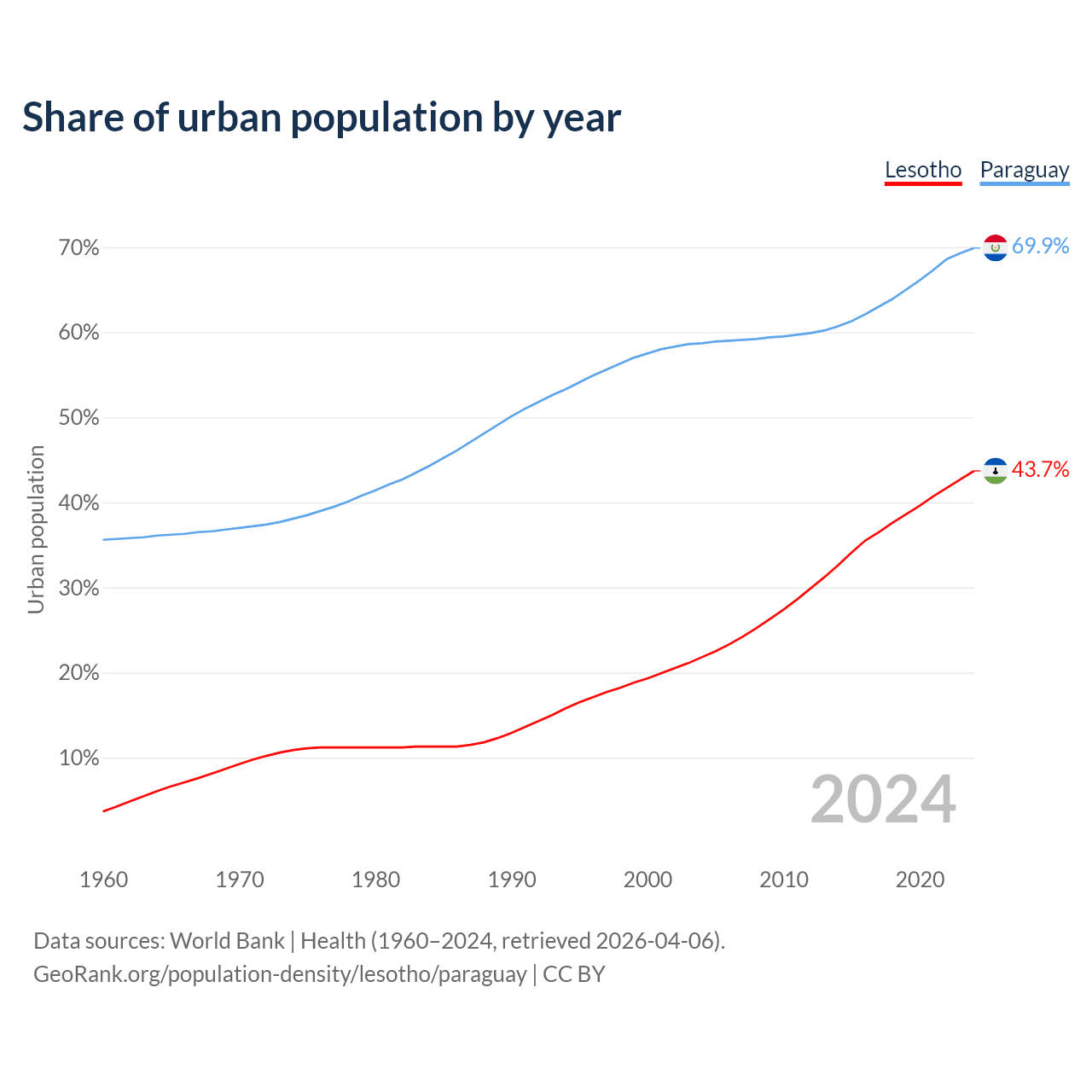 From 2004 to 2024, the share of urban population changed from 21.8% to 43.7% in Lesotho and from 58.7% to 69.9% in Paraguay.
