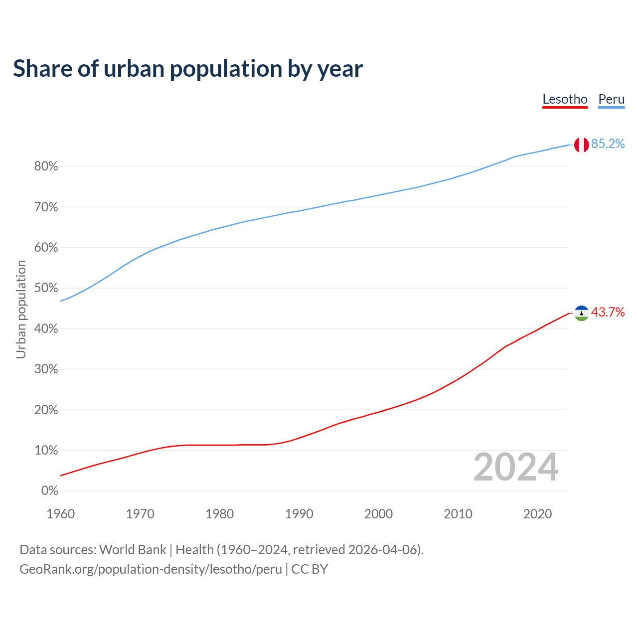 From 2004 to 2024, the share of urban population changed from 21.8% to 43.7% in Lesotho and from 74.4% to 85.2% in Peru.