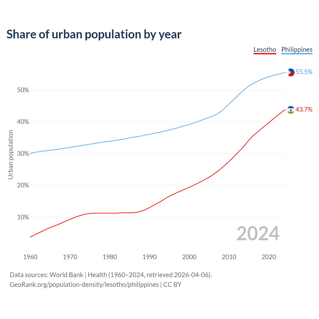 From 2004 to 2024, the share of urban population changed from 21.8% to 43.7% in Lesotho and from 40.9% to 55.5% in the Philippines.