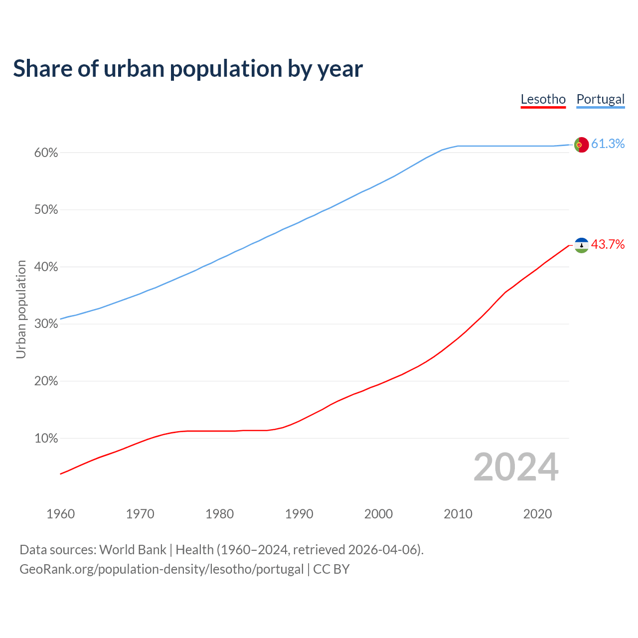 From 2004 to 2024, the share of urban population changed from 21.8% to 43.7% in Lesotho and from 57.4% to 61.3% in Portugal.