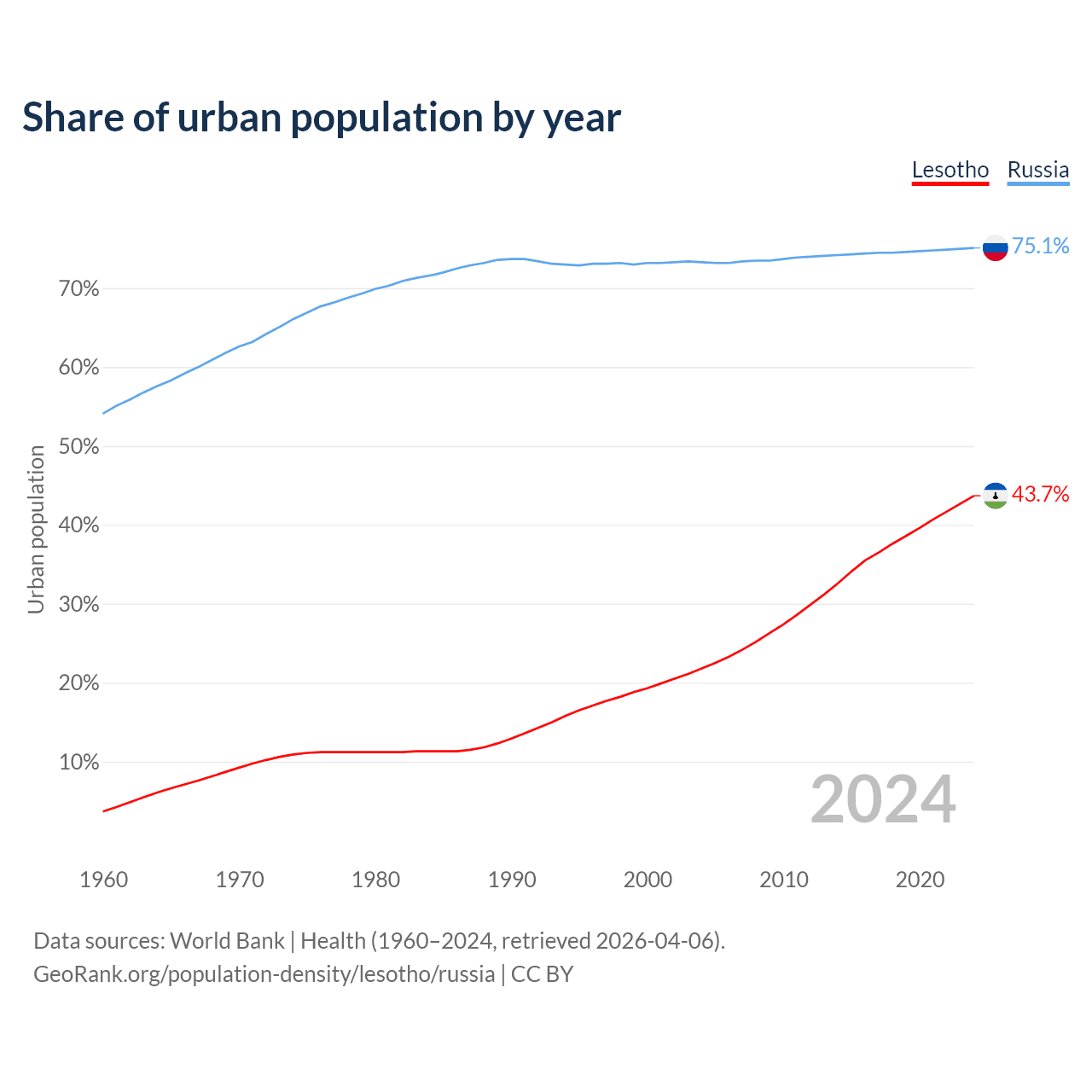 From 2004 to 2024, the share of urban population changed from 21.8% to 43.7% in Lesotho and from 73.3% to 75.1% in Russia.