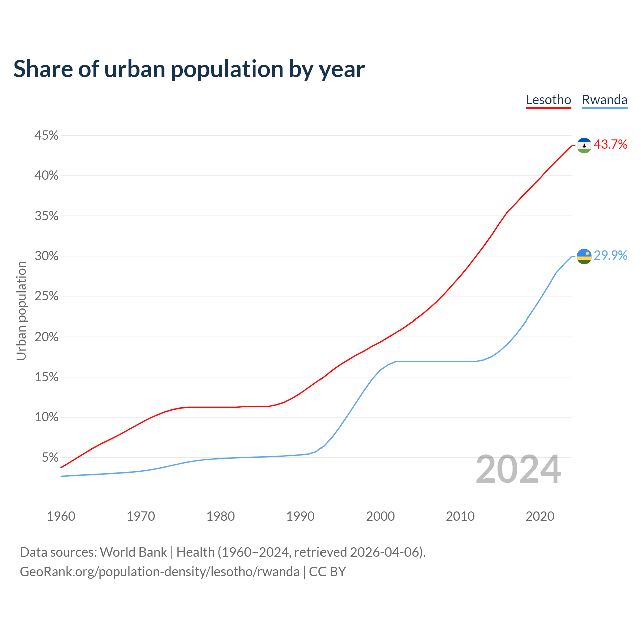 From 2004 to 2024, the share of urban population changed from 21.8% to 43.7% in Lesotho and from 16.9% to 29.9% in Rwanda.