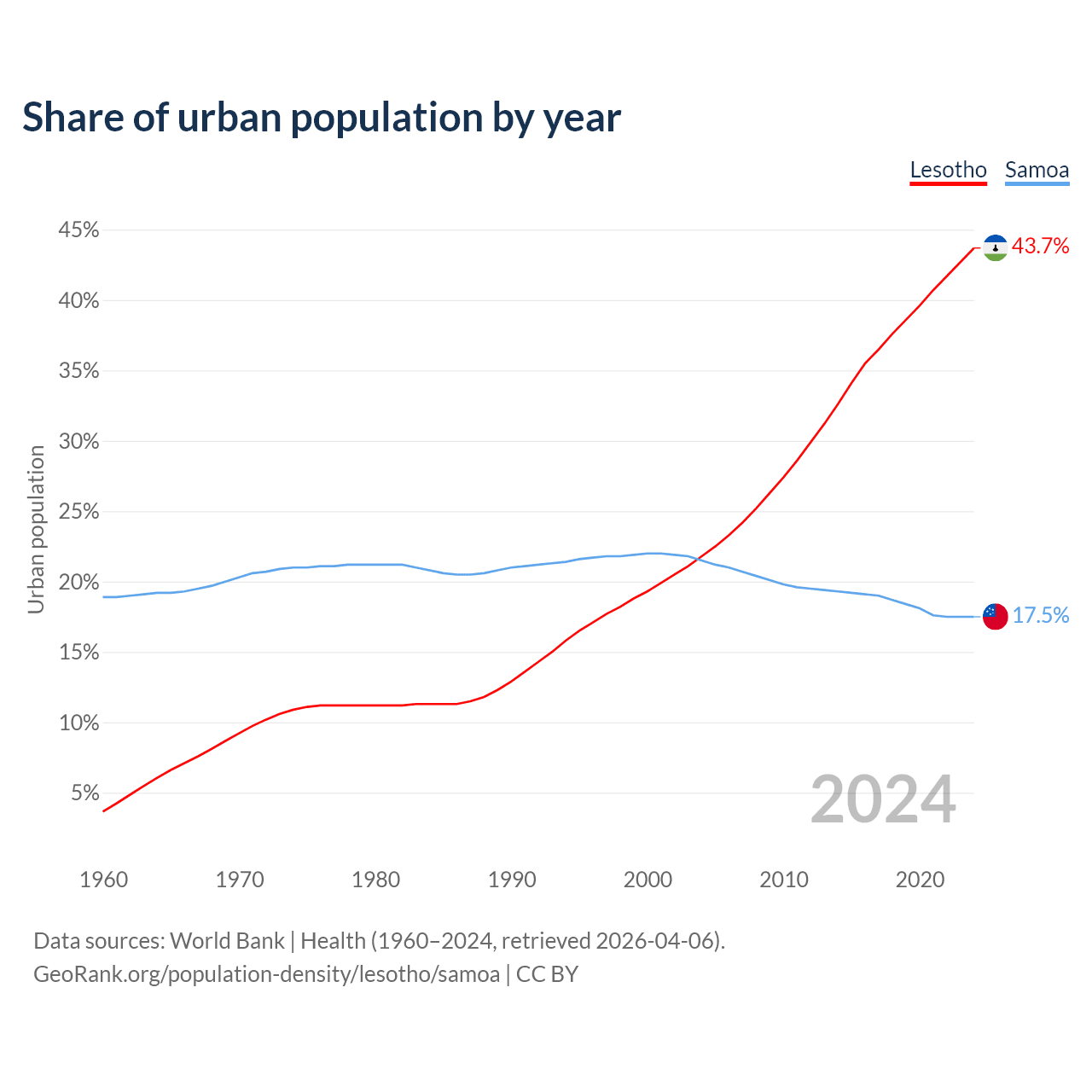 From 2004 to 2024, the share of urban population changed from 21.8% to 43.7% in Lesotho and from 21.5% to 17.5% in Samoa.