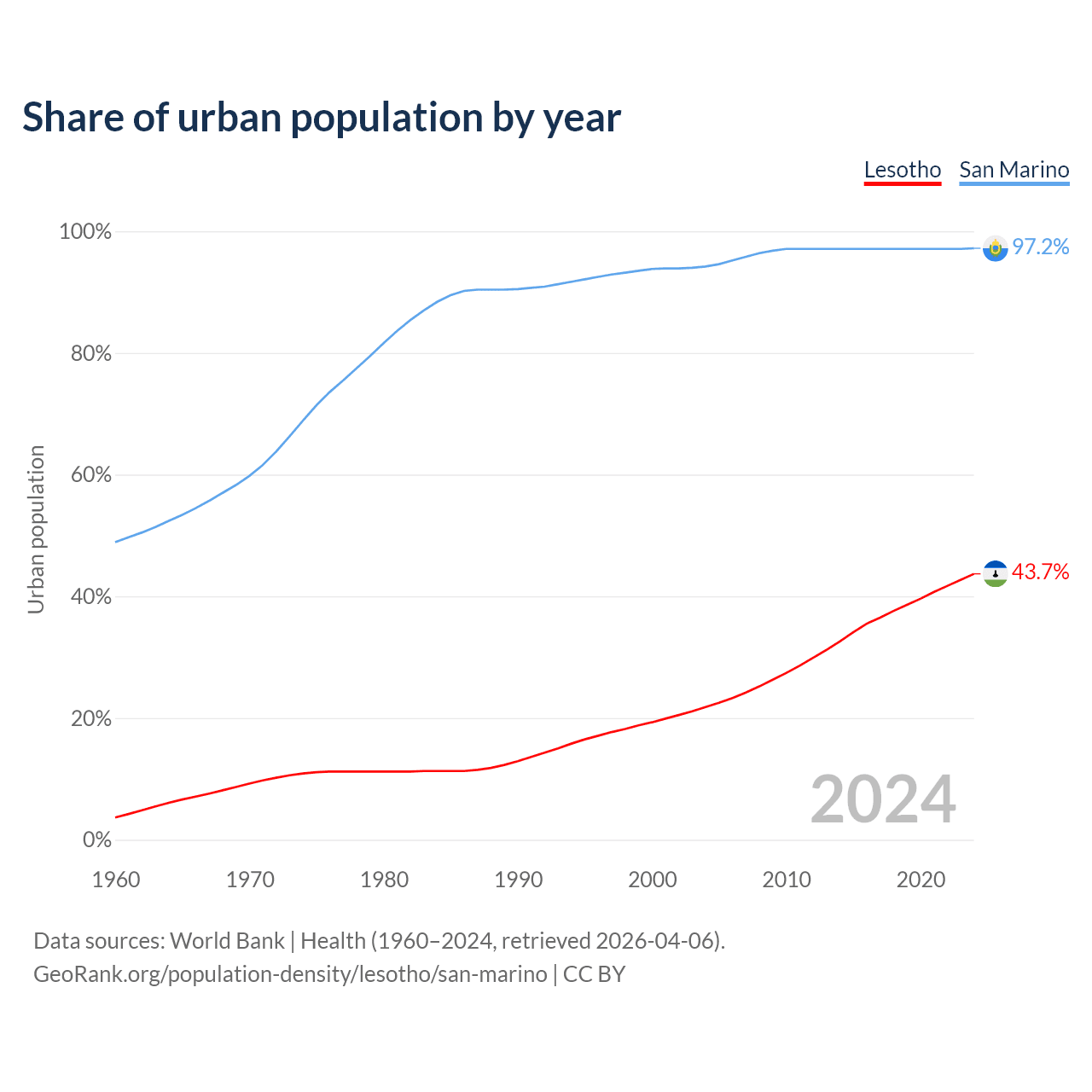 From 2004 to 2024, the share of urban population changed from 21.8% to 43.7% in Lesotho and from 94.2% to 97.2% in San Marino.