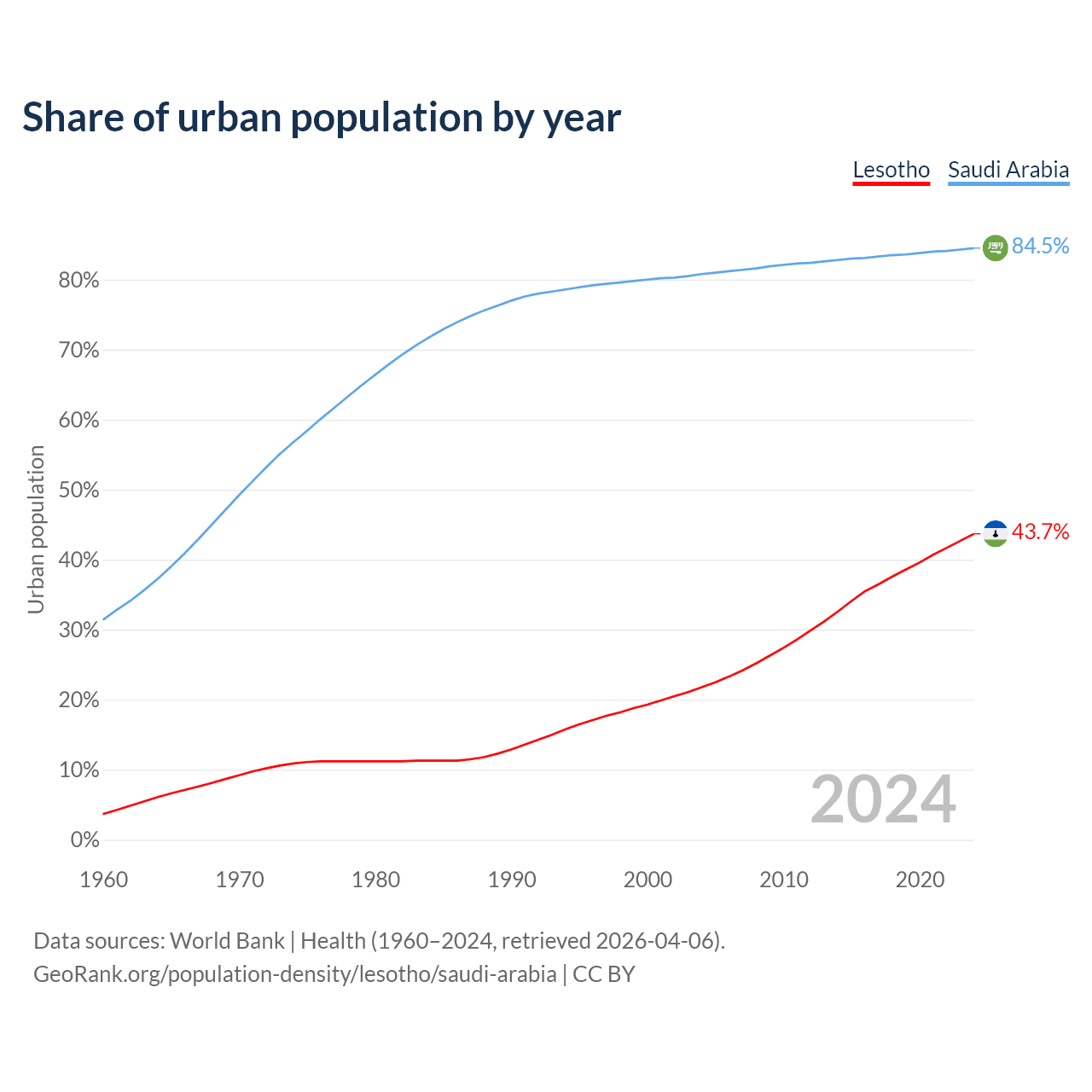 From 2004 to 2024, the share of urban population changed from 21.8% to 43.7% in Lesotho and from 80.8% to 84.5% in Saudi Arabia.