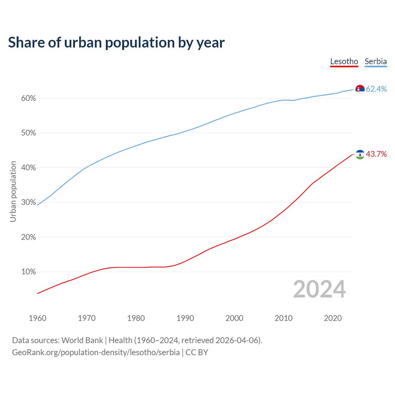 From 2004 to 2024, the share of urban population changed from 21.8% to 43.7% in Lesotho and from 57.3% to 62.4% in Serbia.