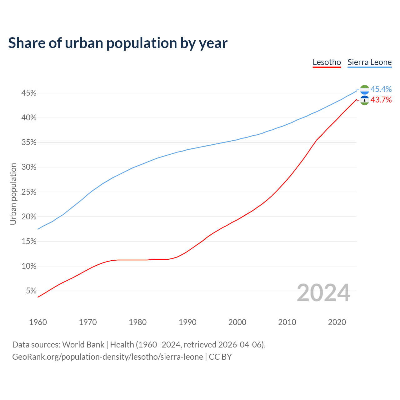From 2006 to 2026, population density in Lesotho increased by 22.9%, compared to a 60% growth in Sierra Leone.