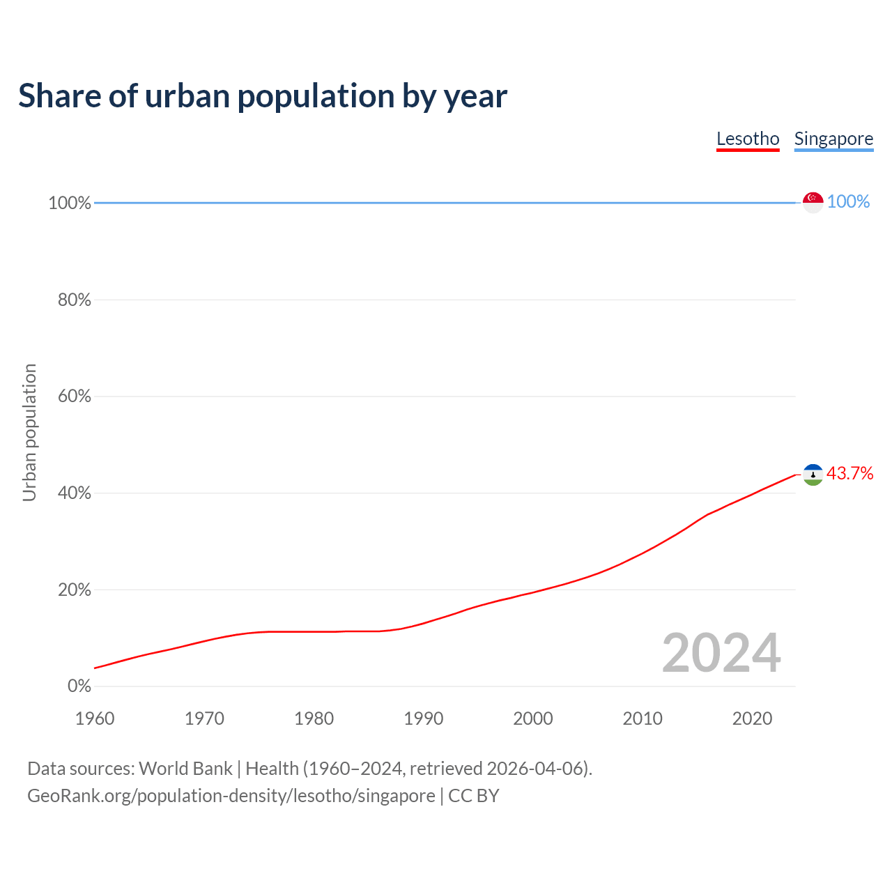 From 2004 to 2024, the share of urban population changed from 21.8% to 43.7% in Lesotho and from 100% to 100% in Singapore.