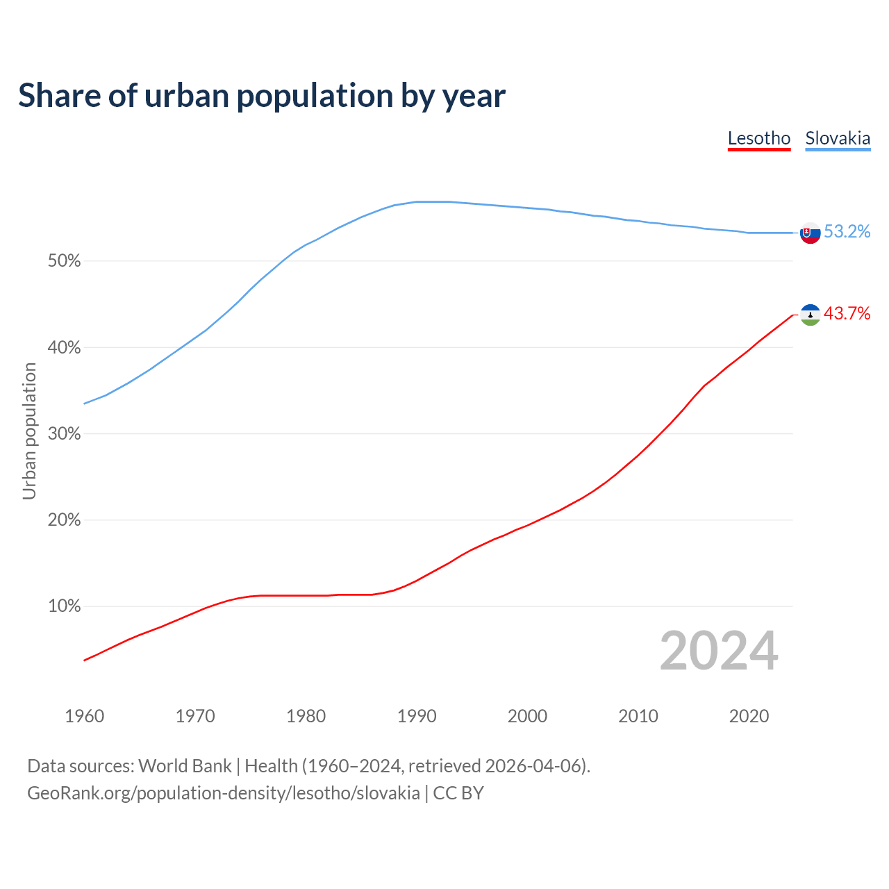 From 2004 to 2024, the share of urban population changed from 21.8% to 43.7% in Lesotho and from 55.6% to 53.2% in Slovakia.