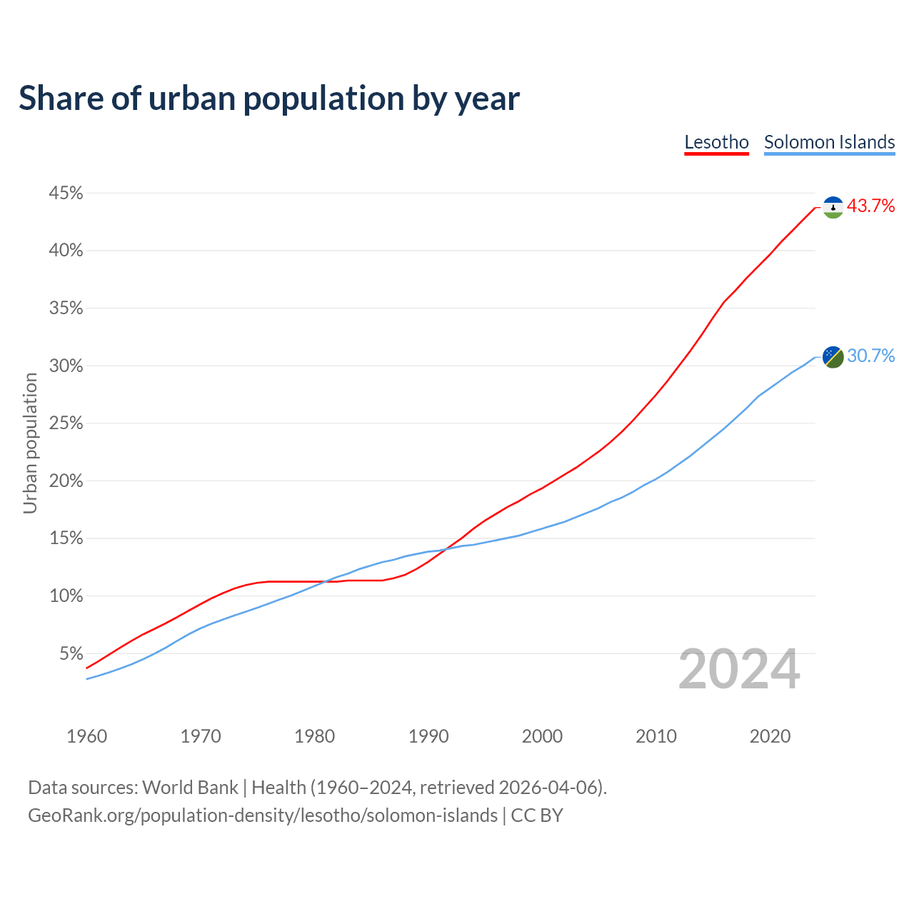 From 2004 to 2024, the share of urban population changed from 21.8% to 43.7% in Lesotho and from 17.2% to 30.7% in the Solomon Islands.
