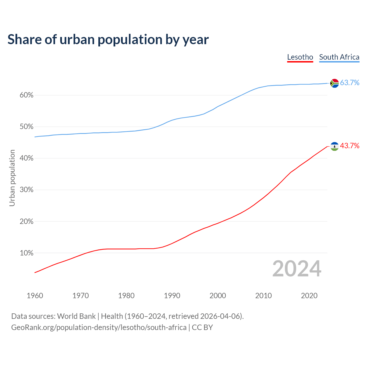From 2004 to 2024, the share of urban population changed from 21.8% to 43.7% in Lesotho and from 59.1% to 63.7% in South Africa.