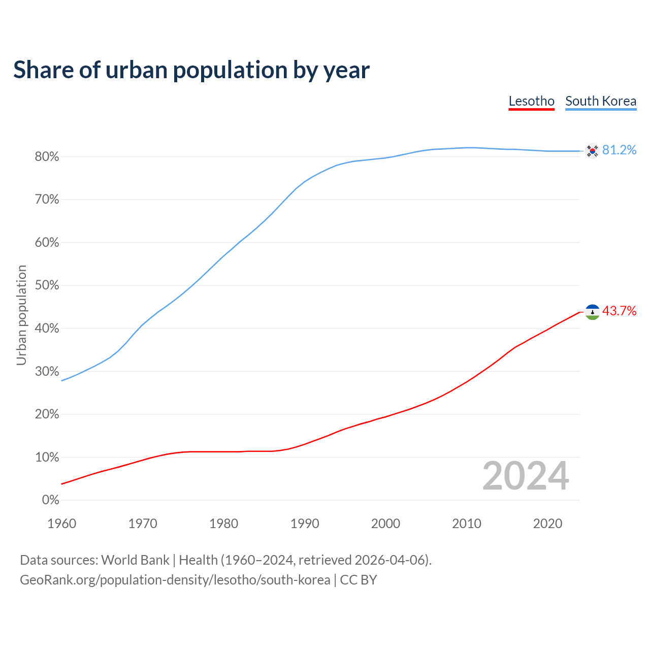 From 2004 to 2024, the share of urban population changed from 21.8% to 43.7% in Lesotho and from 81.1% to 81.2% in South Korea.