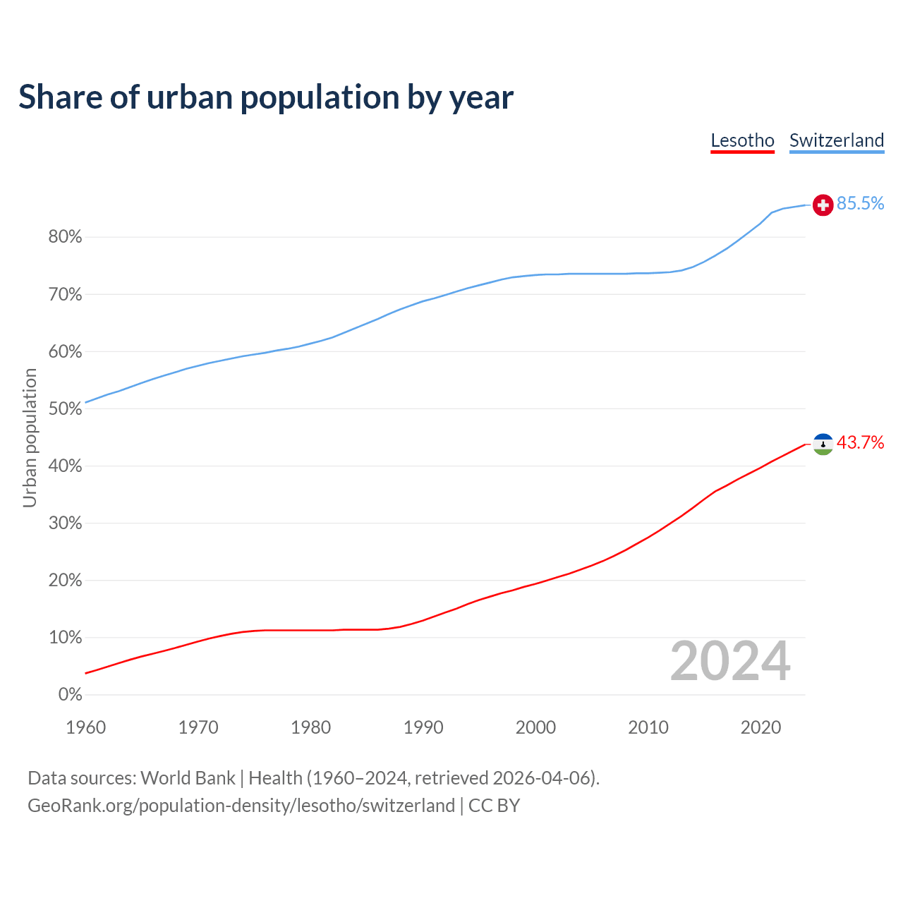 From 2004 to 2024, the share of urban population changed from 21.8% to 43.7% in Lesotho and from 73.5% to 85.5% in Switzerland.