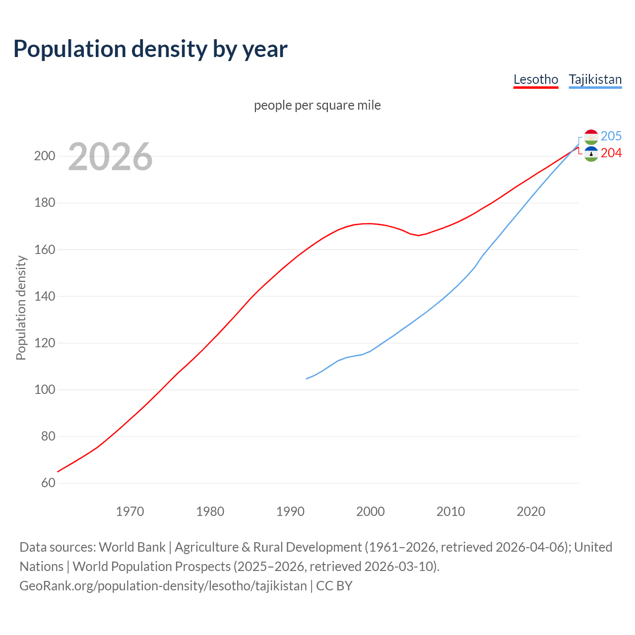 From 2006 to 2026, population density in Lesotho increased by 22.9%, compared to a 57% growth in Tajikistan.