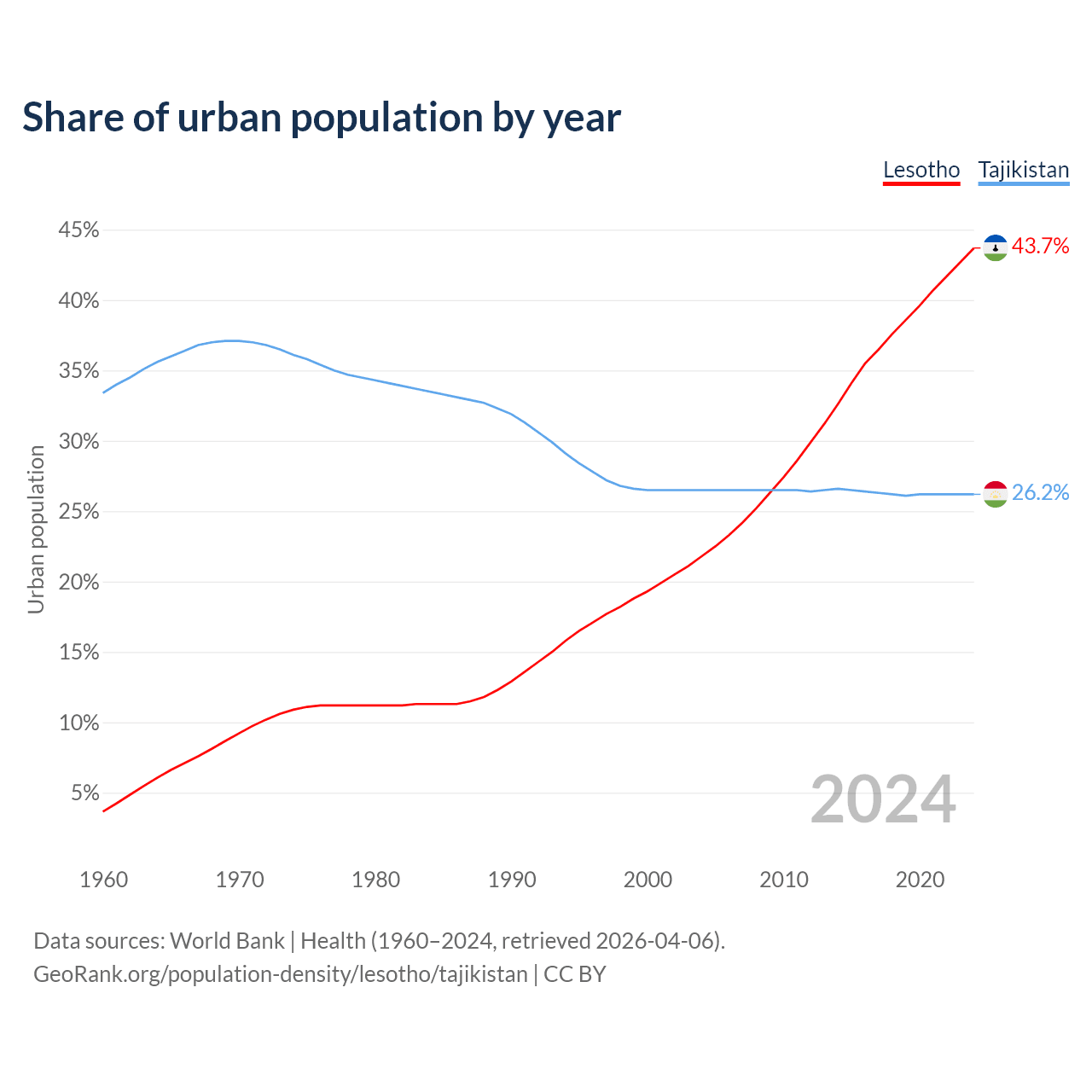 From 2004 to 2024, the share of urban population changed from 21.8% to 43.7% in Lesotho and from 26.5% to 26.2% in Tajikistan.